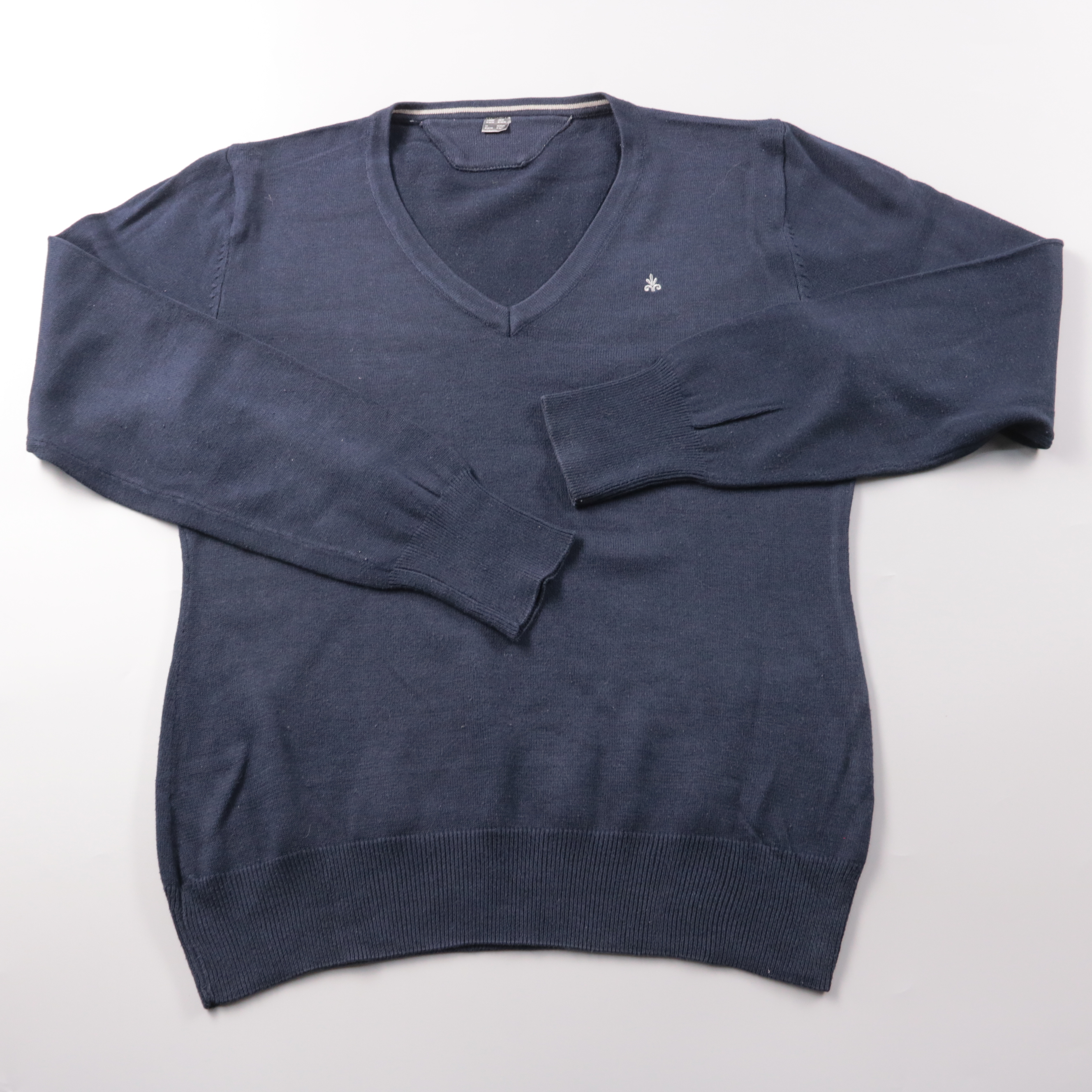 Мужской джемпер с V-образным вырезом в тёмно-синем цвете, мягкий трикотаж с небольшим логотипом на груди. Подойдёт для офиса и повседневных образов, хорошо смотрится с рубашкой или футболкой. Практичен в уходе и комфортен для носки в прохладную погоду.