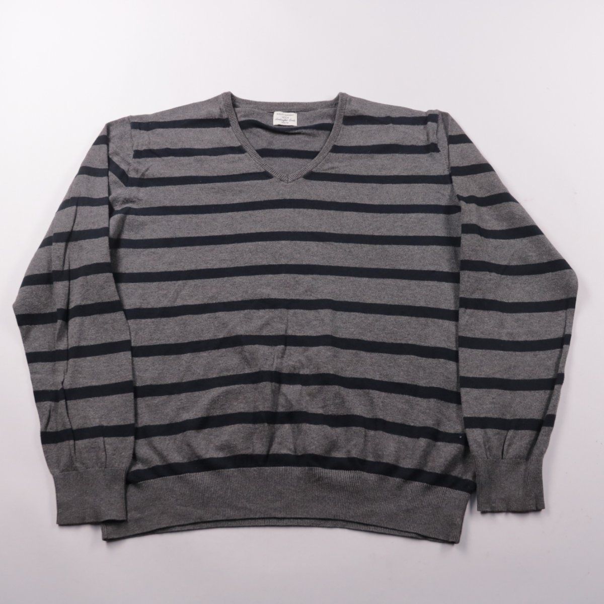 Мужской джемпер C&A с V-образным вырезом и горизонтальной полоской в серо-чёрной гамме. Подойдёт для повседневной носки в офис или на прогулки в прохладную погоду. Практичный плюс — хлопковая основа комфортна к телу и хорошо дышит.