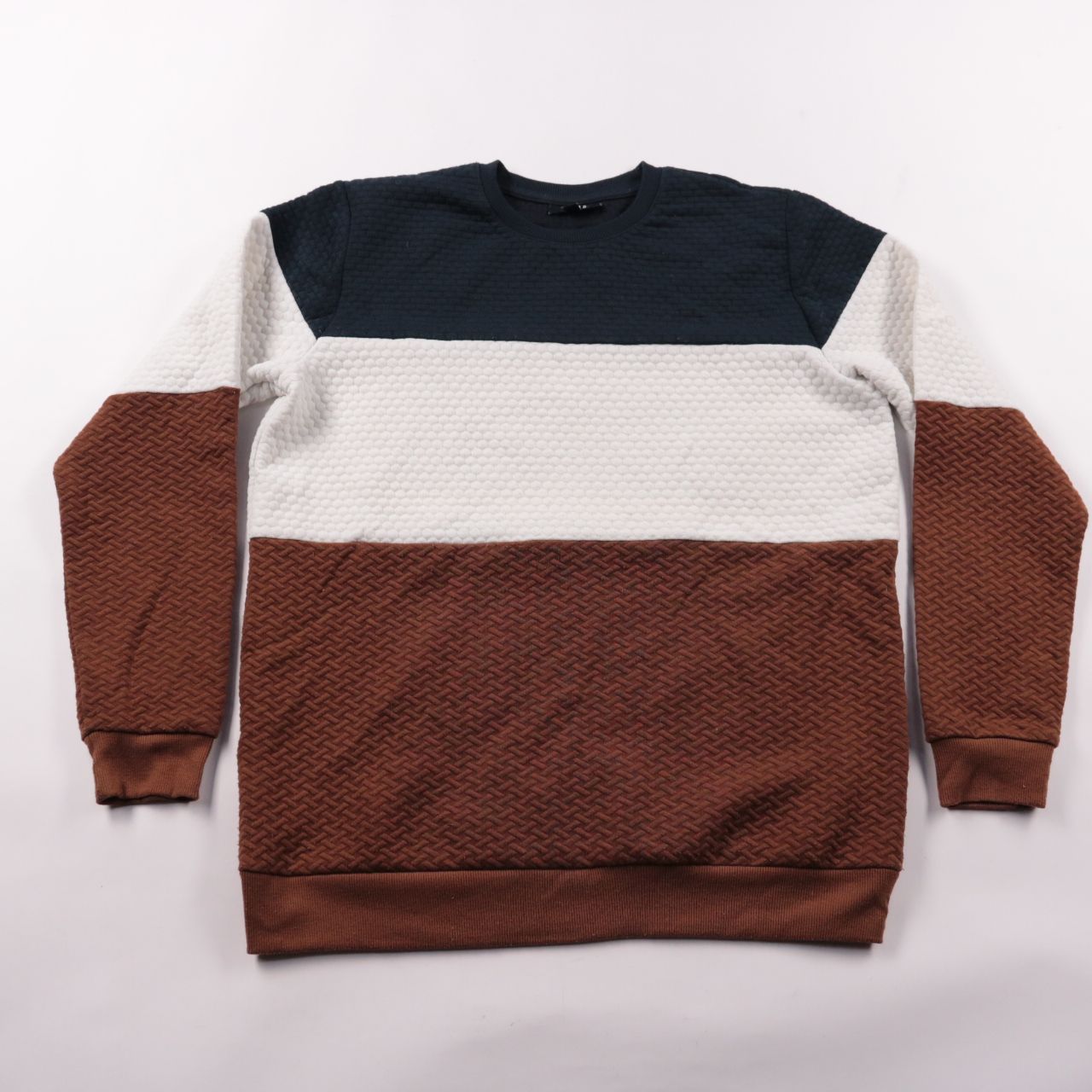 Мужской свитшот SMOG Regular Fit с фактурным трикотажем и колорблок-дизайном (тёмно-синий, белый и коричневый). Подойдёт для повседневной носки и прогулок в прохладную погоду, хорошо сочетается с джинсами и чиносами. Практичный плюс — плотная ткань и э...