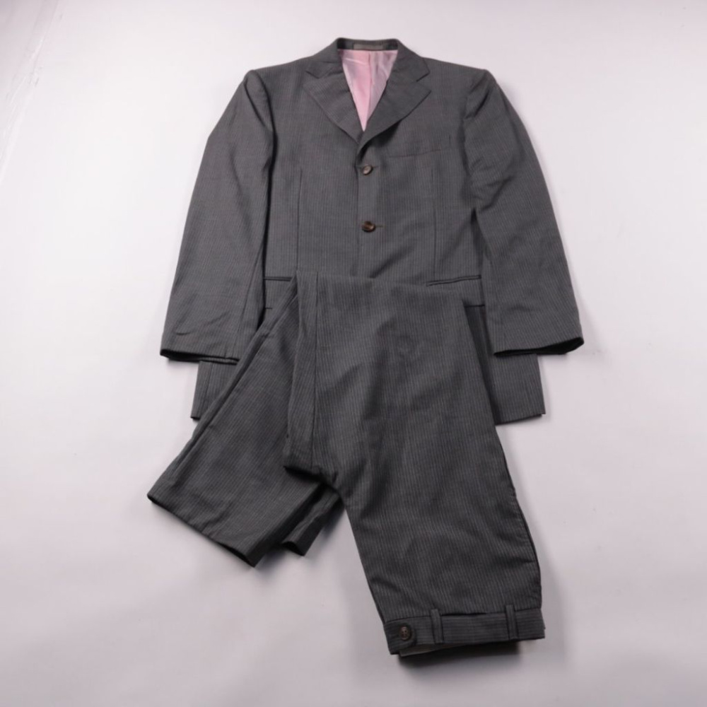Мужской костюм (пиджак и брюки) в сером цвете с тонкой полоской, выполнен из 100% шерсти. Подойдёт для офиса и деловых мероприятий, посадка классическая. Подкладка из Bemberg делает носку более комфортной и хорошо «дышит».