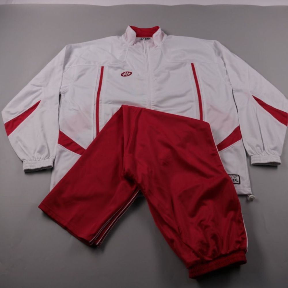 Мужской спортивный костюм Hello: белая олимпийка на молнии с красными вставками и красные брюки. Подойдёт для прогулок, тренировок и повседневной носки в прохладную погоду. Полиэстер быстро сохнет и не требует сложного ухода.