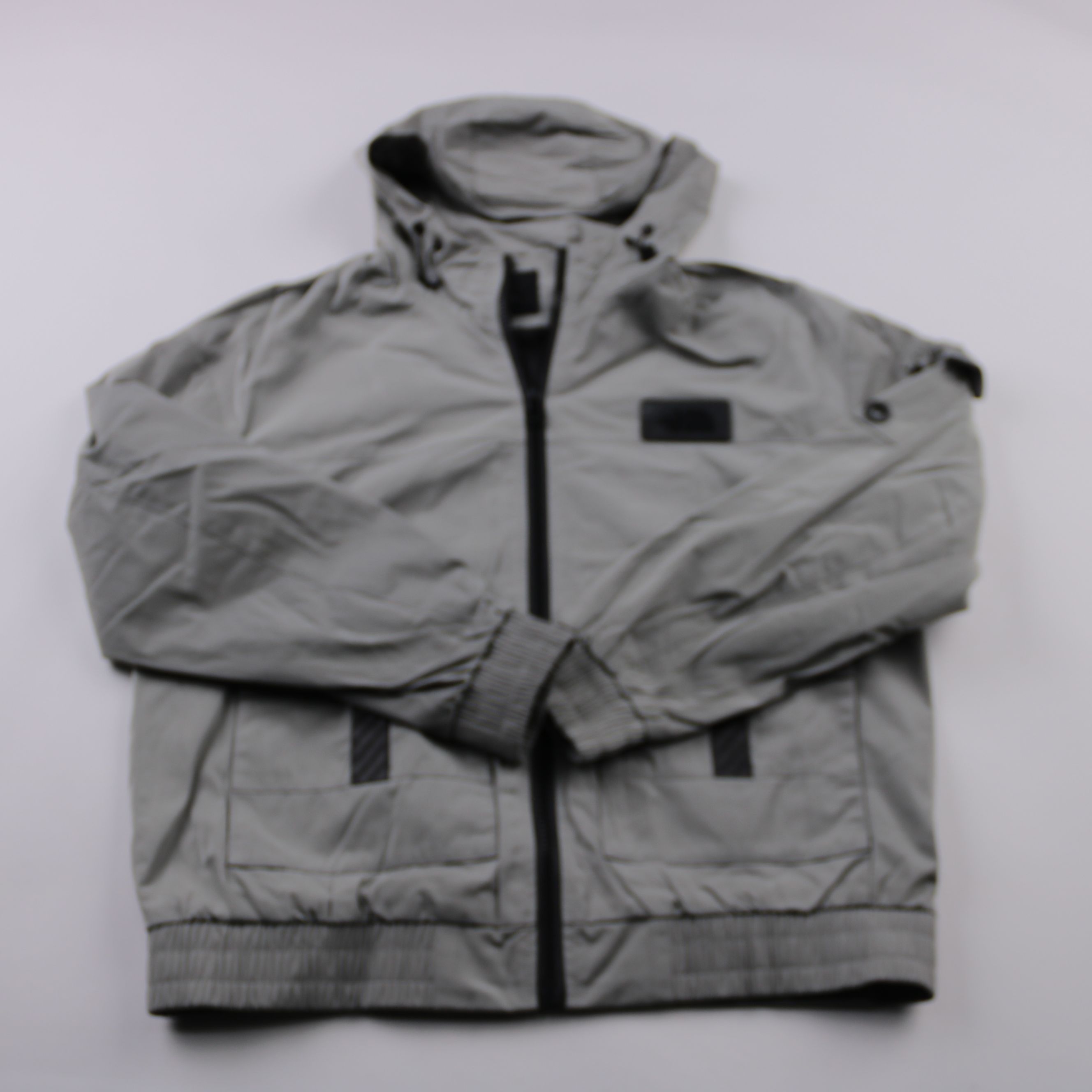 Лёгкая мужская куртка с капюшоном и застёжкой на молнию, бренд на бирке не указан. Подойдёт для повседневной носки в прохладную погоду и на прогулки, есть удобные карманы. Практичный плюс — плотная синтетическая ткань легко чистится и защищает от ветра.