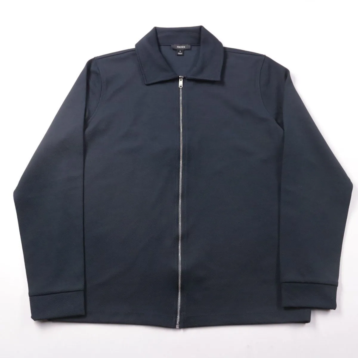 Мужская лёгкая куртка Reiss тёмно-синего цвета на молнии, с отложным воротником. Подойдёт для повседневной носки в городе в прохладную погоду и для образов smart casual. Практична тем, что ткань с небольшим эластаном лучше держит форму и комфортнее в движении.