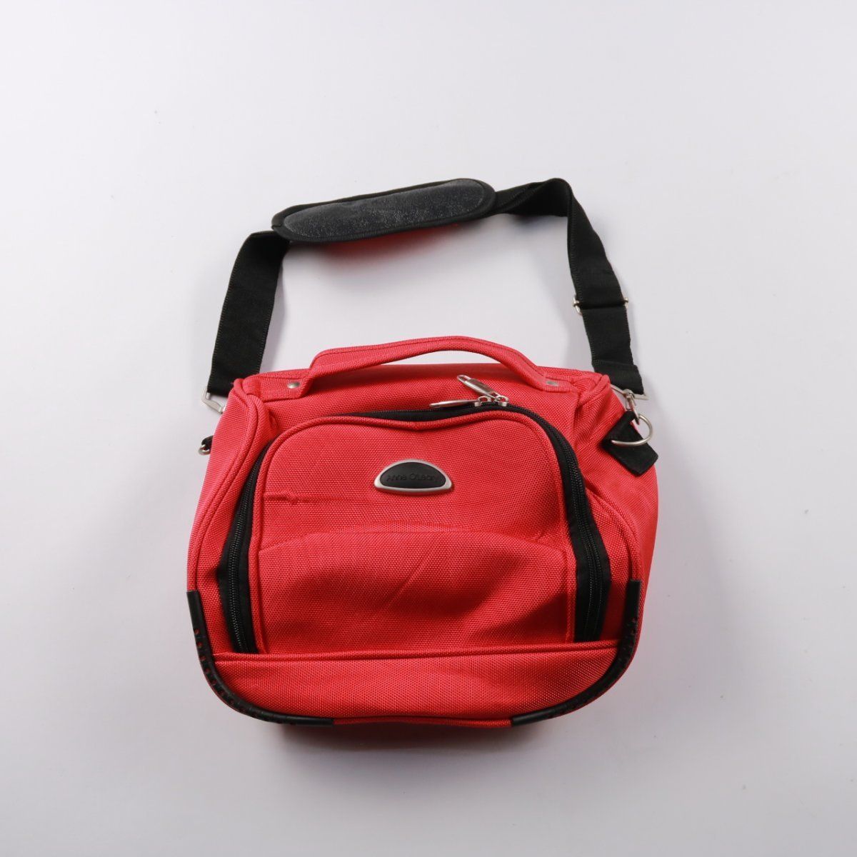 Текстильная сумка через плечо с короткой ручкой, бренд не указан. Подойдёт для повседневных дел и поездок: есть основное отделение и внешние карманы на молнии. Практичный плюс — регулируемый ремень с мягкой накладкой на плечо.