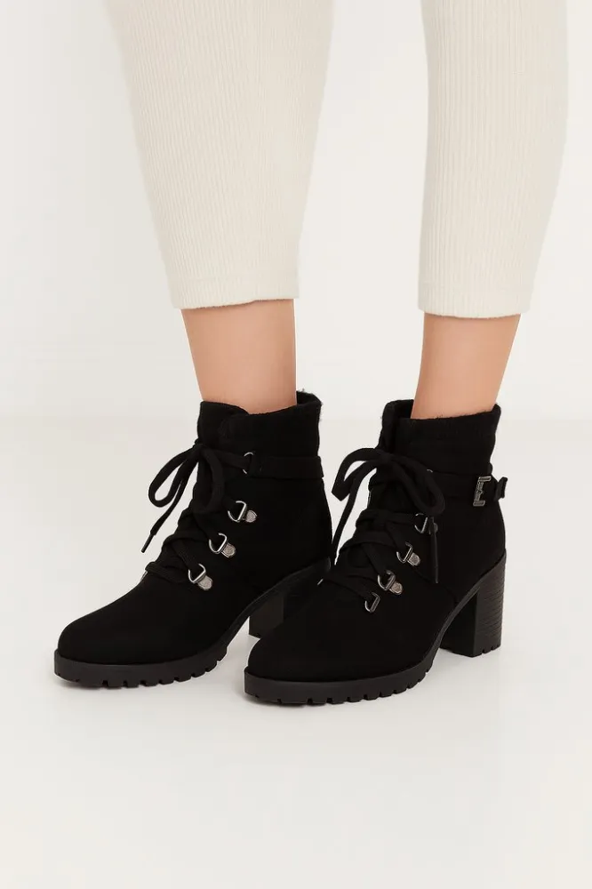 Женские ботильоны на устойчивом каблуке с шнуровкой и боковой молнией, сверху мягкий утеплённый кант. Подойдут на зиму и холодную осень под джинсы или платья. Рифлёная подошва лучше держит на скользкой дороге.