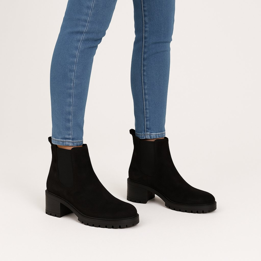 Женские ботильоны без бренда, чёрные, с эластичными вставками по бокам и устойчивым каблуком. Подойдут на каждый день в межсезонье, хорошо сочетаются с джинсами и платьями. Рифлёная подошва даёт лучшее сцепление и удобнее в городской ходьбе.