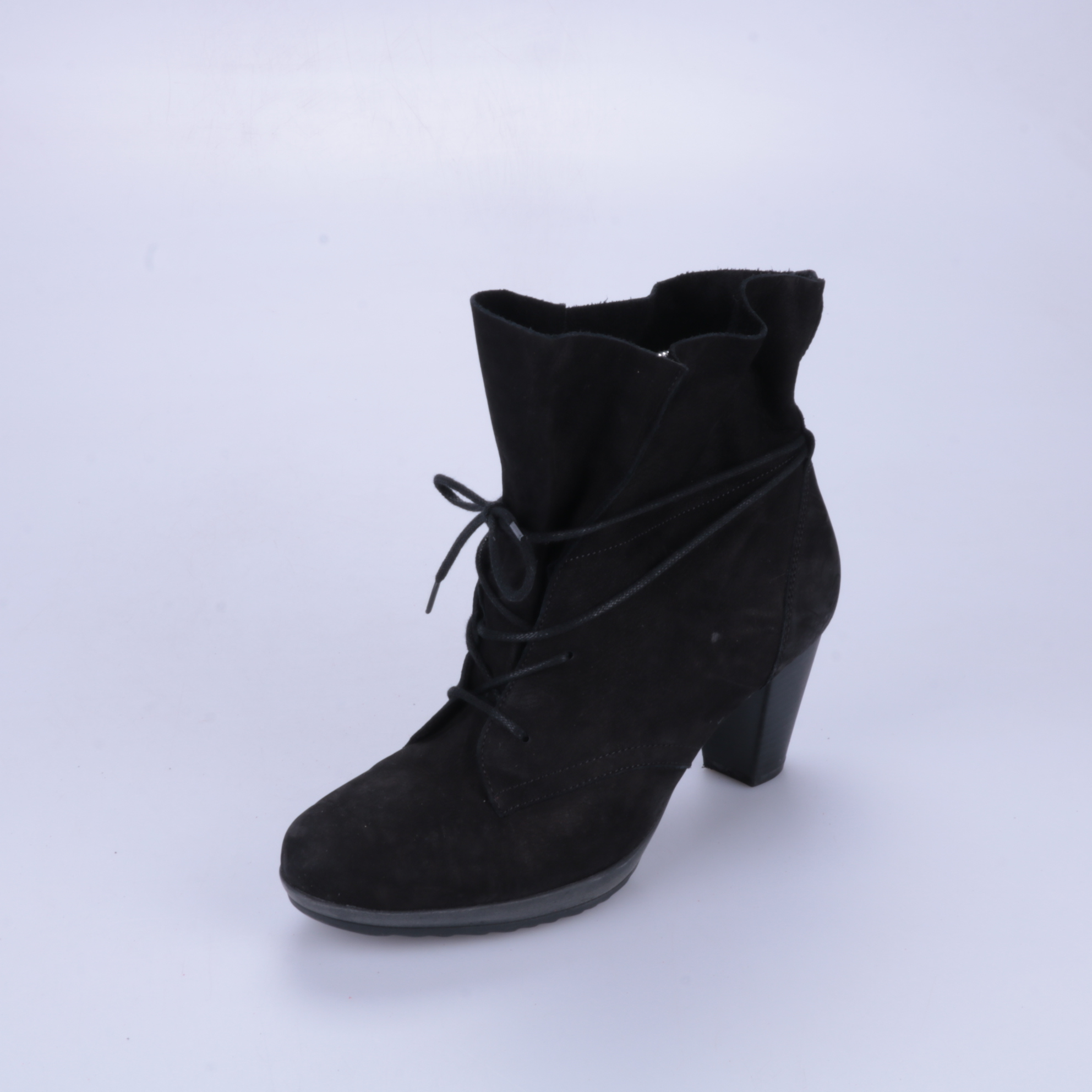 Ботильоны Gabor из замши, чёрного цвета, на устойчивом каблуке и со шнуровкой. Подойдут для повседневных образов в прохладную погоду и на выход, хорошо сочетаются с джинсами и платьями. Практичный плюс — удобная колодка и нескользящая подошва.