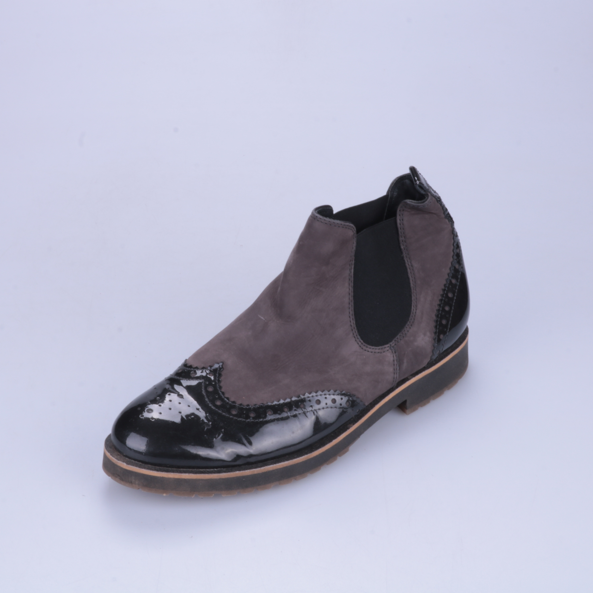 Ботильоны Paul Green в стиле челси: комбинированный верх из замши и лаковой кожи с декоративной перфорацией. Подойдут для демисезона и повседневных образов с джинсами или платьем. Рифлёная подошва даёт хорошее сцепление и устойчивость при ходьбе.