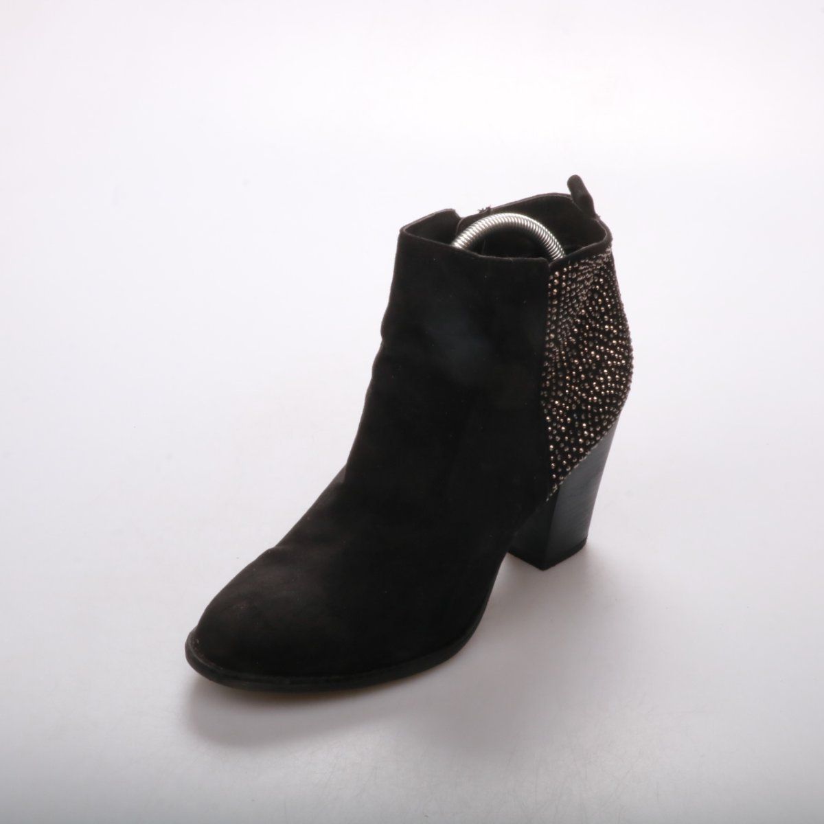Женские ботильоны Walk из мягкого текстиля под замшу, чёрного цвета, с устойчивым каблуком и боковой молнией. Акцент — задник с декоративными стразами, подойдут для повседневных образов и выхода. Удобно быстро надевать за счёт молнии, каблук устойчивый для ходьбы.