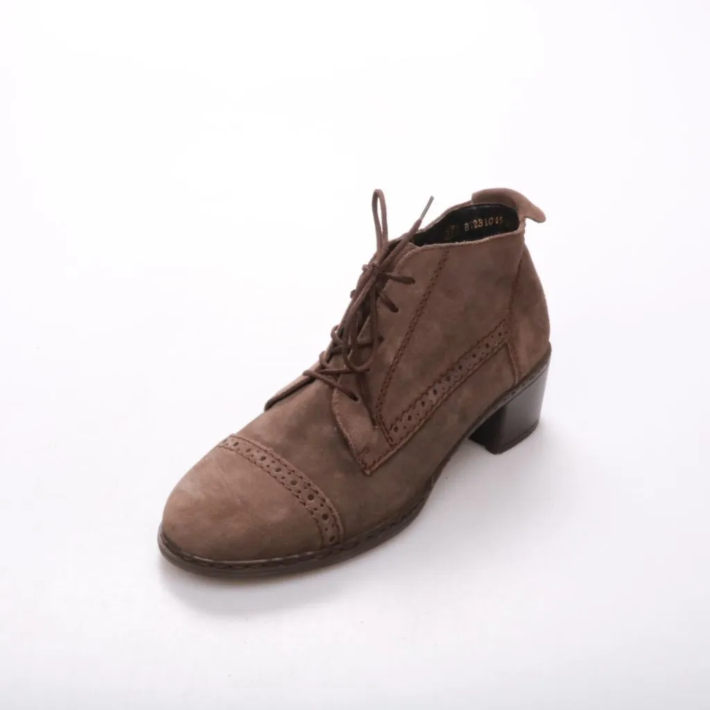 Женские замшевые ботильоны Rieker на устойчивом каблуке и шнуровке, коричневого цвета. Подойдут для повседневной носки в межсезонье и сочетания с джинсами или платьями. Практичное преимущество — рельефная резиновая подошва для более уверенного сцепления.