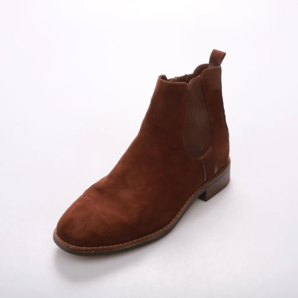 Женские ботильоны из коричневой натуральной замши с боковой молнией и невысоким каблуком. Подойдут на каждый день в межсезонье и хорошо смотрятся с джинсами и брюками. Практичное преимущество — удобная посадка и устойчивая подошва.