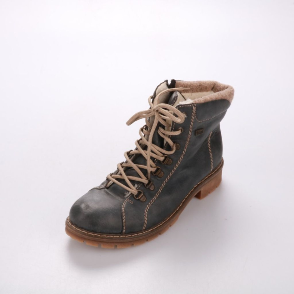 Женские ботинки Rieker из натуральной кожи в тёмно-сером цвете, на шнуровке с боковой молнией. Подойдут для повседневных прогулок в прохладную погоду, хорошо сочетаются с джинсами и casual-образами. Рифлёная подошва даёт устойчивость и лучше держит сце...