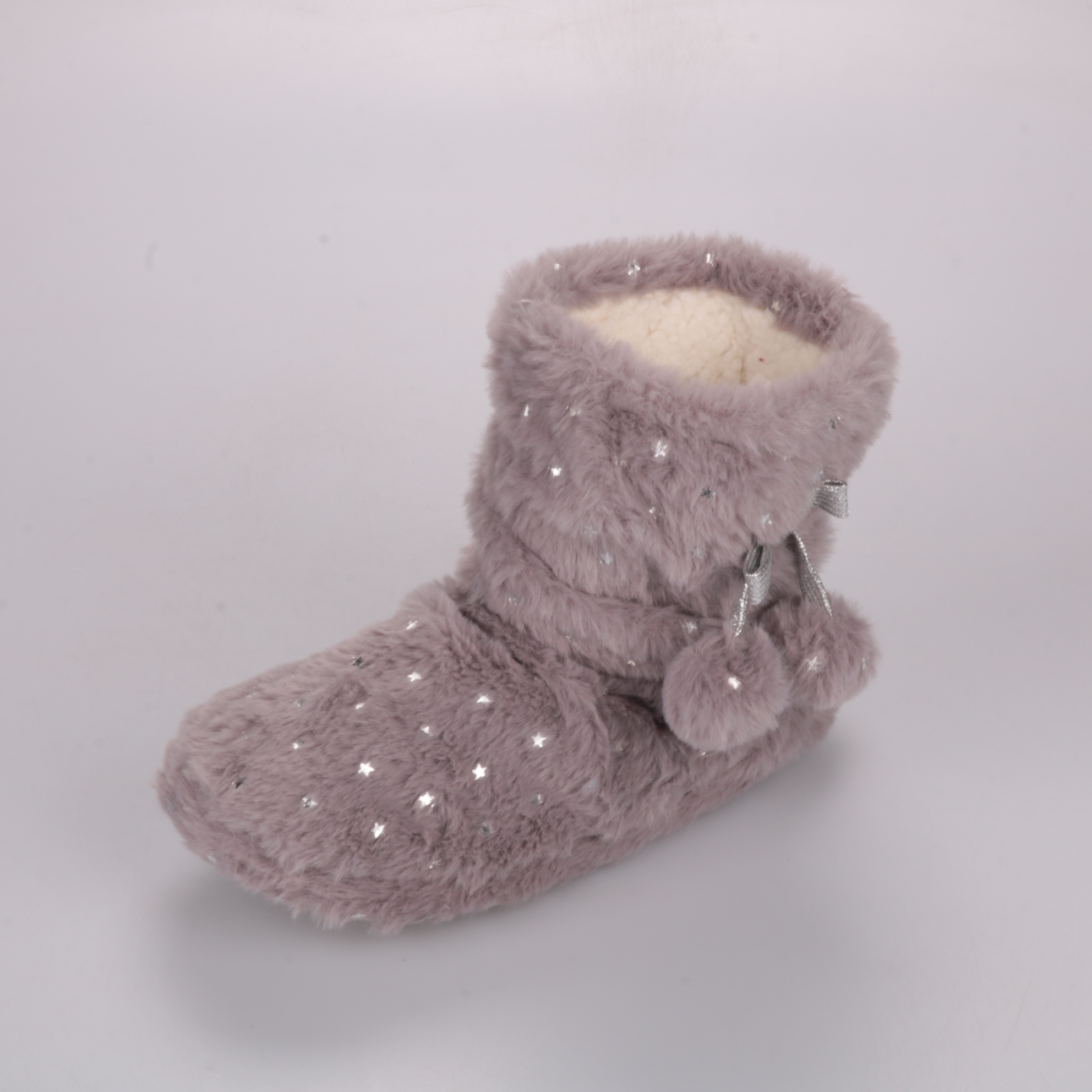 Домашние тапочки-угги из мягкого плюша с блёстками-звёздочками и декоративными помпонами. Подойдут для дома в холодное время года, чтобы ноги были в тепле. Противоскользящая подошва помогает увереннее ходить по гладкому полу.