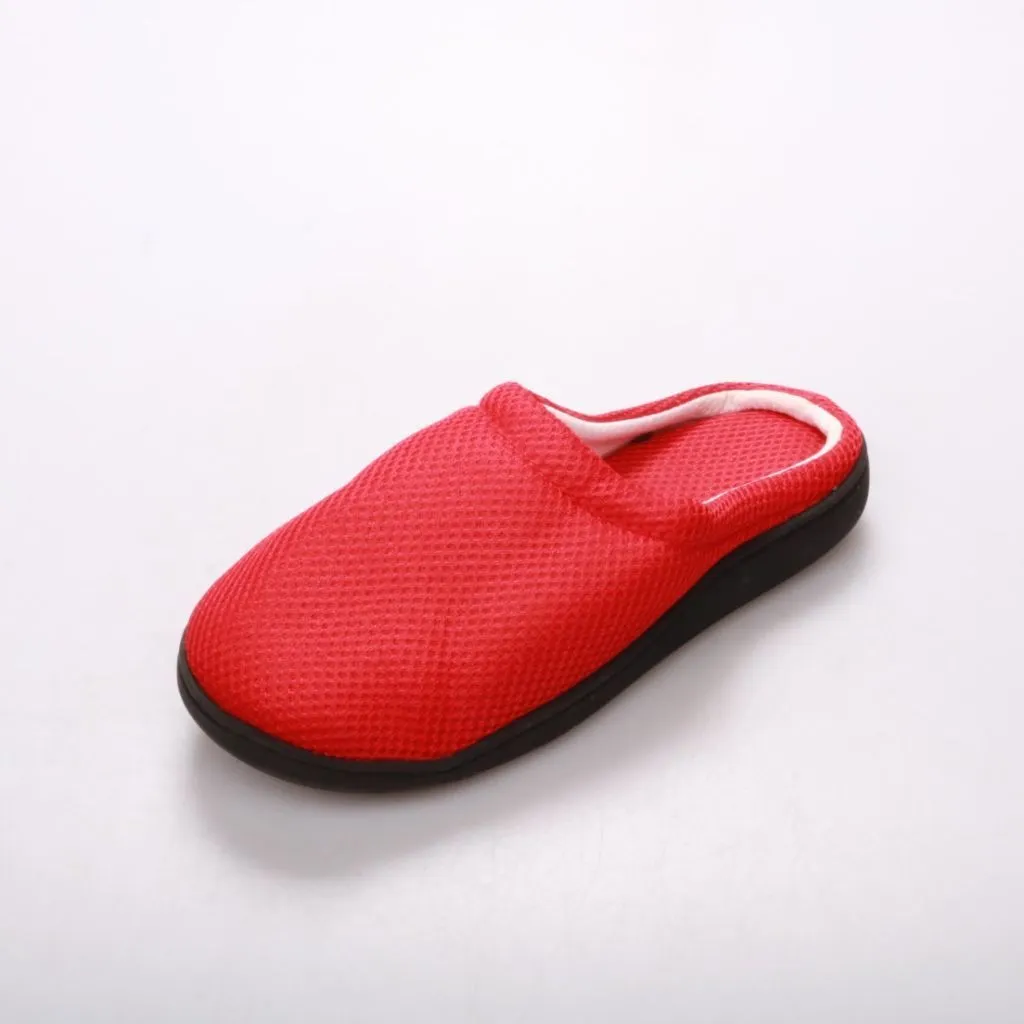 Домашние тапочки без задника из красного синтетического текстиля (сетчатый верх) с чёрной подошвой. Подойдут для дома или дачи, легко надеваются и снимаются. Практичное преимущество — лёгкие и с рельефной подошвой, которая меньше скользит.