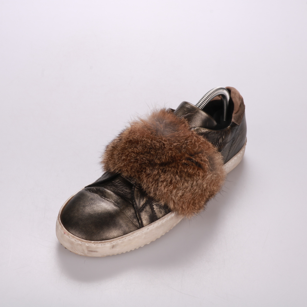 Кеды Ovyé из натуральной кожи в тёмном оттенке с декоративной меховой вставкой спереди. Подойдут для повседневных образов в прохладную погоду и на межсезонье. Резиновая подошва с выраженным протектором даёт хорошее сцепление и износостойкость.