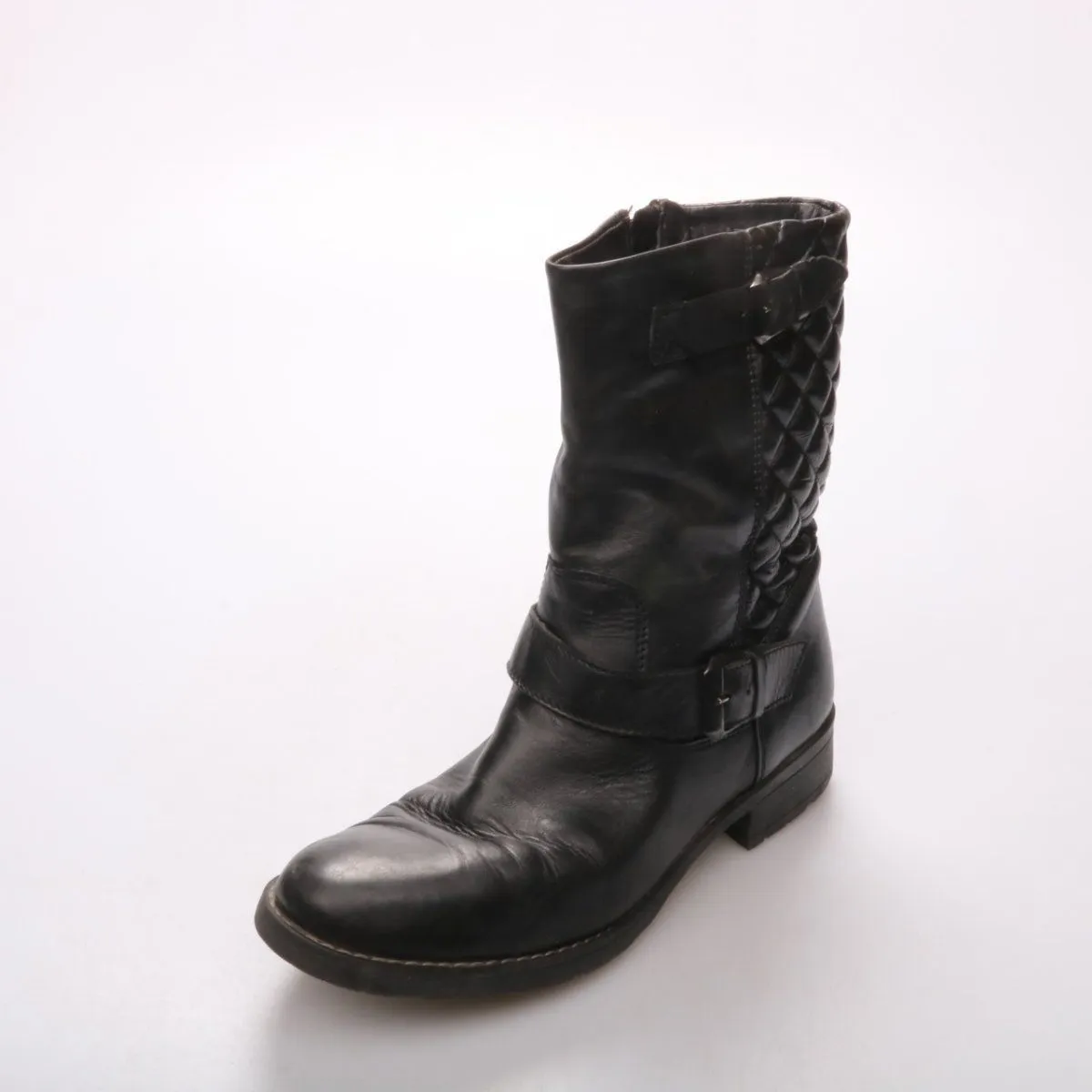 Женские полусапоги Tamaris из гладкой чёрной кожи с простёжкой на голенище и ремешком с пряжкой. Подойдут для демисезона и повседневных городских образов с джинсами или платьями. Удобно надевать благодаря боковой молнии и устойчивому низкому каблуку.