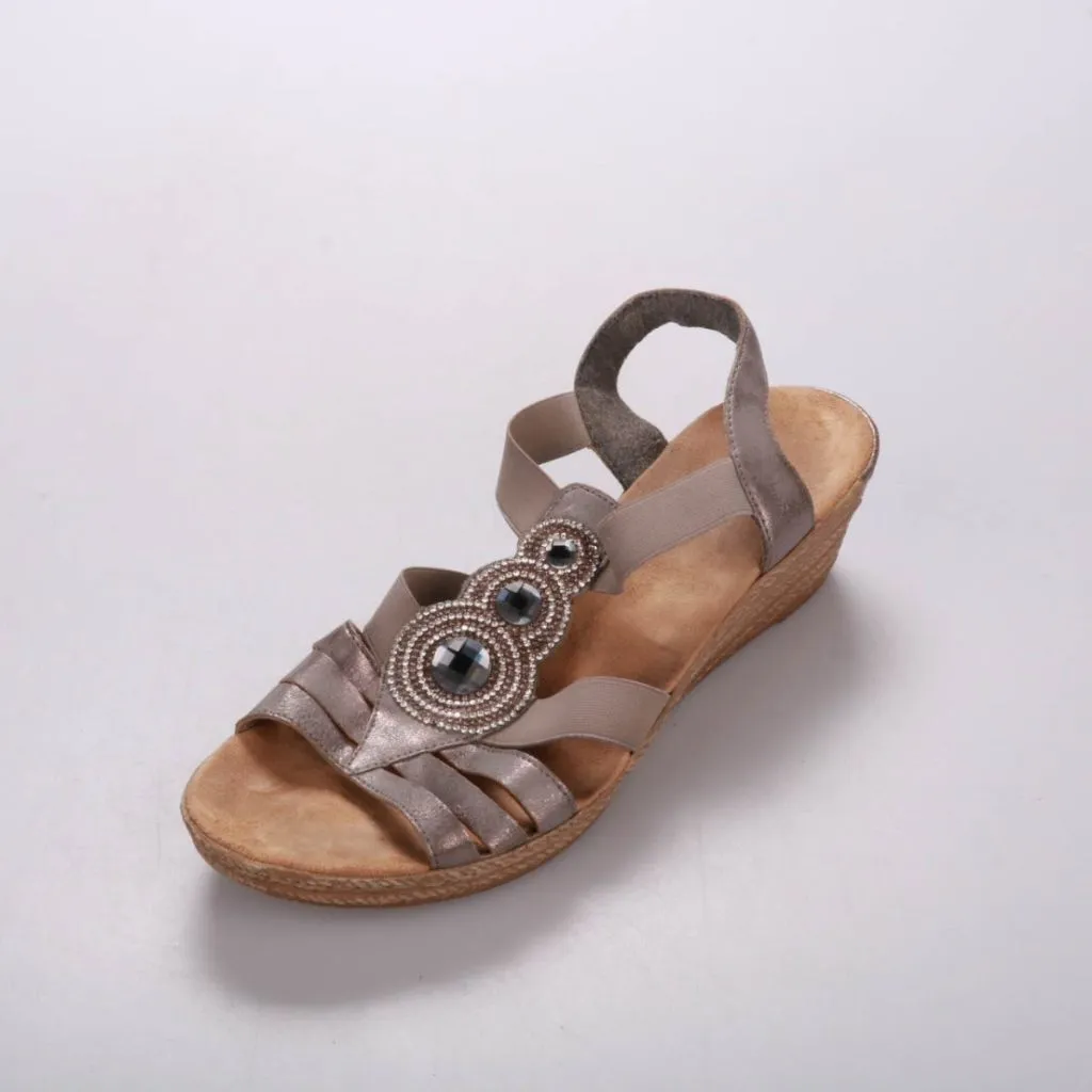 Женские сандалии Rieker на устойчивой танкетке, с декоративной вставкой из бусин и камней на подъёме. Подойдут для летних прогулок и повседневной носки благодаря эластичным ремешкам и мягкой стельке. Рельефная подошва помогает снизить скольжение на асф...