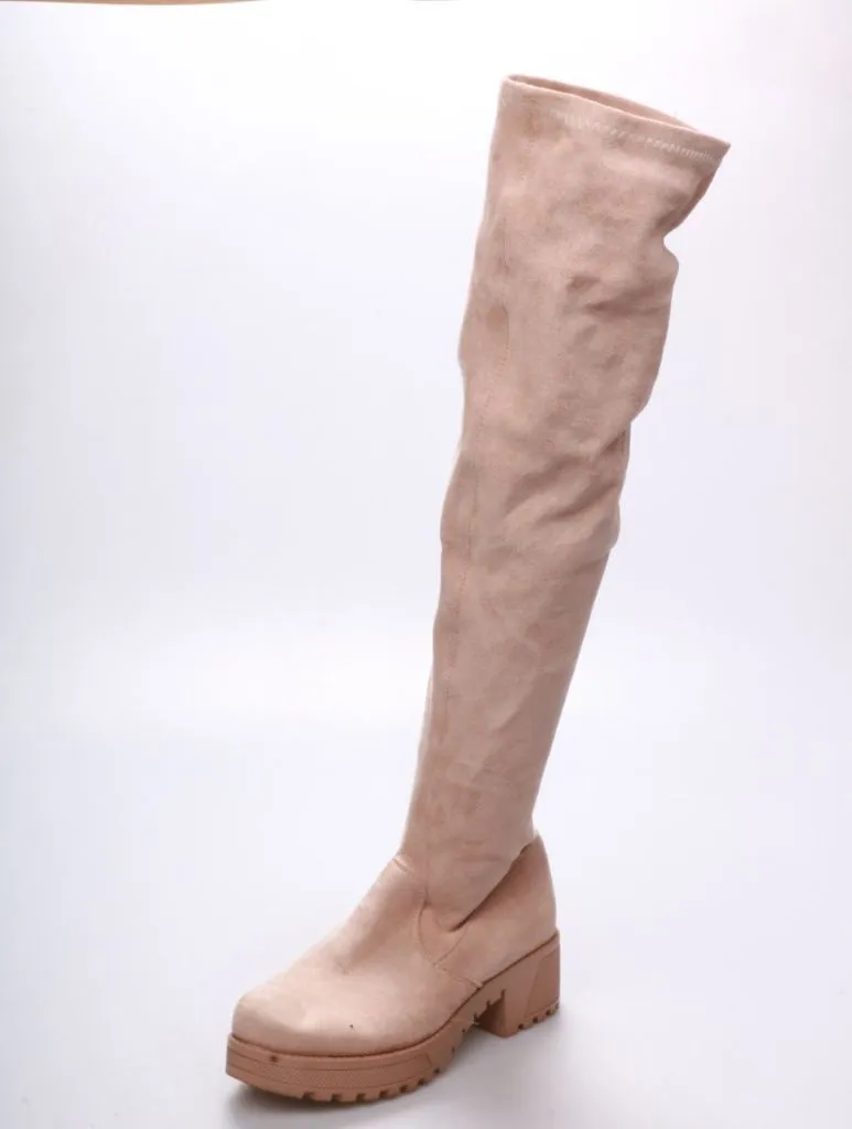 Сапоги без бренда, высокие (выше колена) из замшевого материала бежевого цвета на устойчивом каблуке и тракторной подошве. Подойдут для повседневной носки в прохладную погоду и сочетаний с платьями, юбками и узкими брюками. Практичное преимущество — бо...