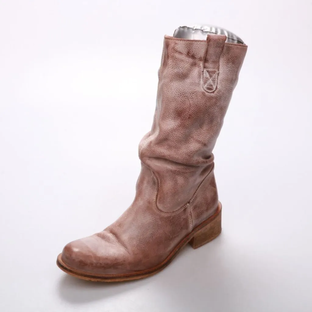 Женские кожаные сапоги без бренда, мягкая фактурная кожа с естественными заломами и петлёй для удобного надевания. Подойдут для повседневных образов в прохладную погоду весной и осенью. Устойчивый невысокий каблук делает их удобными для длительной ходьбы.
