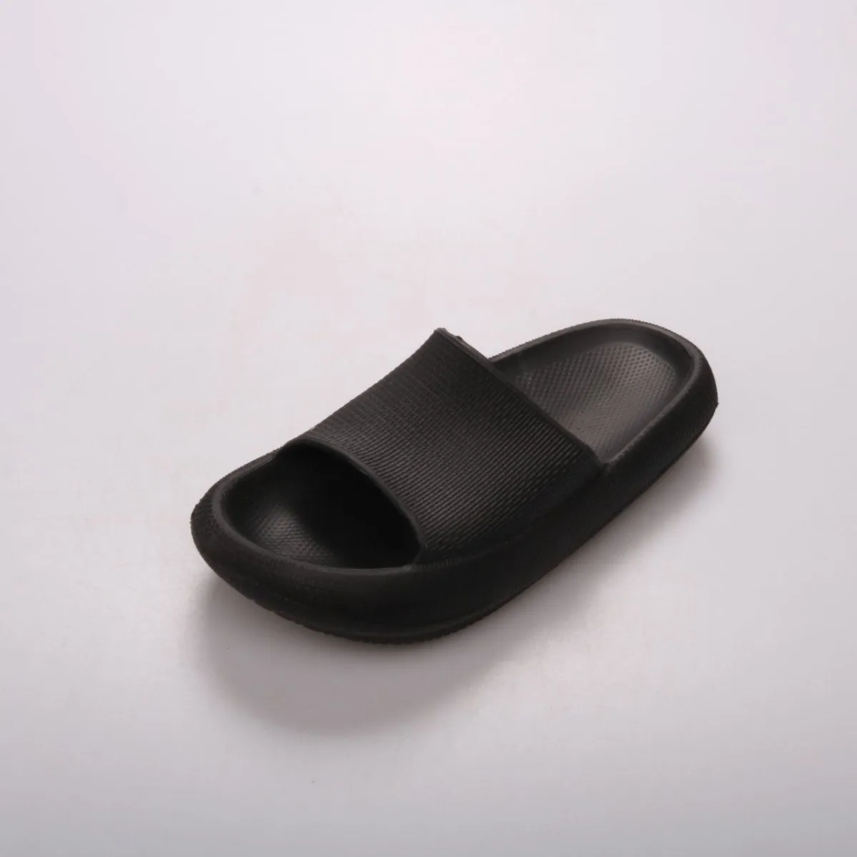Чёрные шлёпанцы без бренда, мягкие и лёгкие, с широкой перемычкой. Подойдут для пляжа, бассейна, дачи и дома. Рельефная подошва помогает меньше скользить на мокром полу.