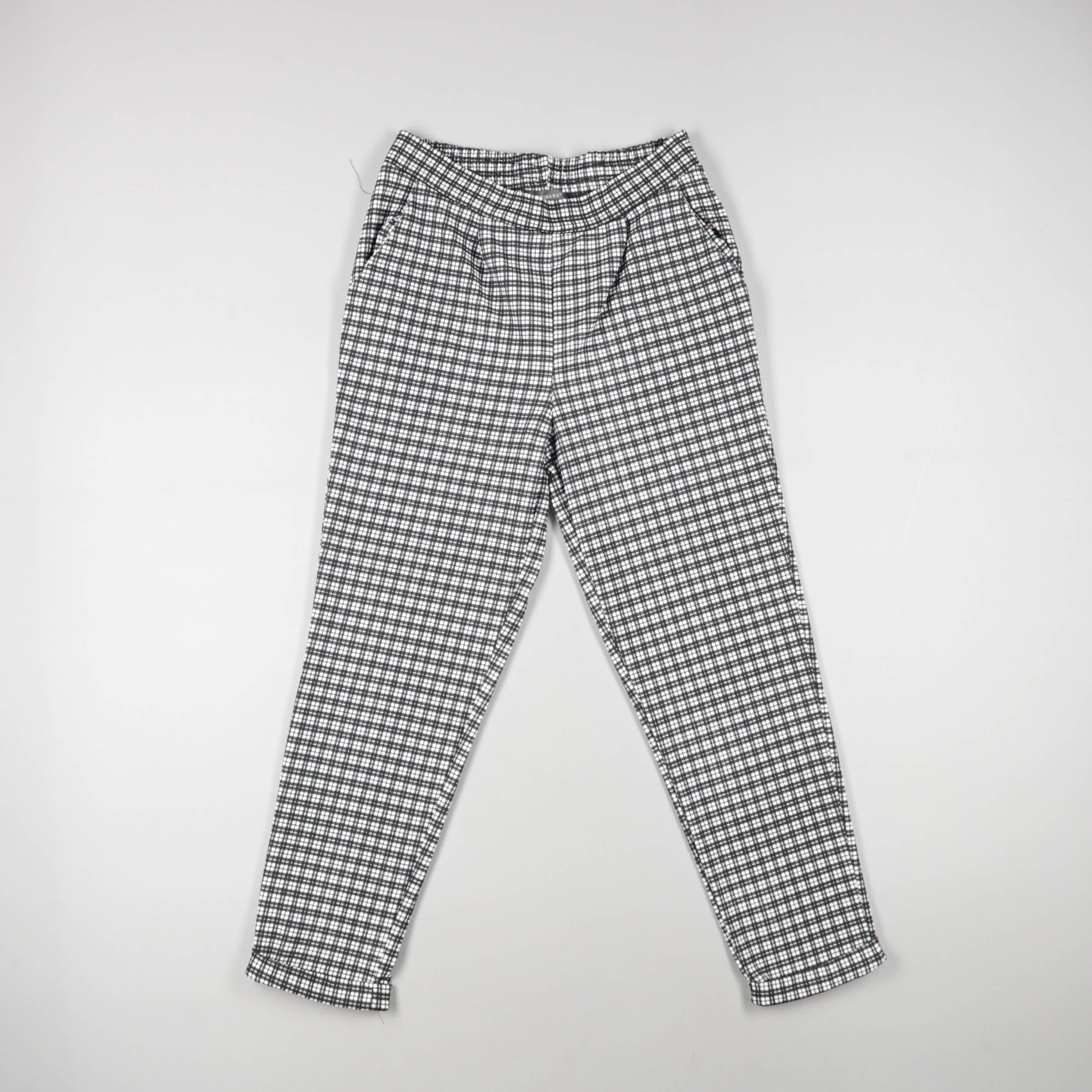 Женские брюки в мелкую чёрно-белую клетку, зауженный силуэт. Подойдут для повседневных образов и офиса с однотонным верхом. Практичны тем, что рисунок хорошо скрывает мелкие следы носки и легко сочетается с базовыми вещами.