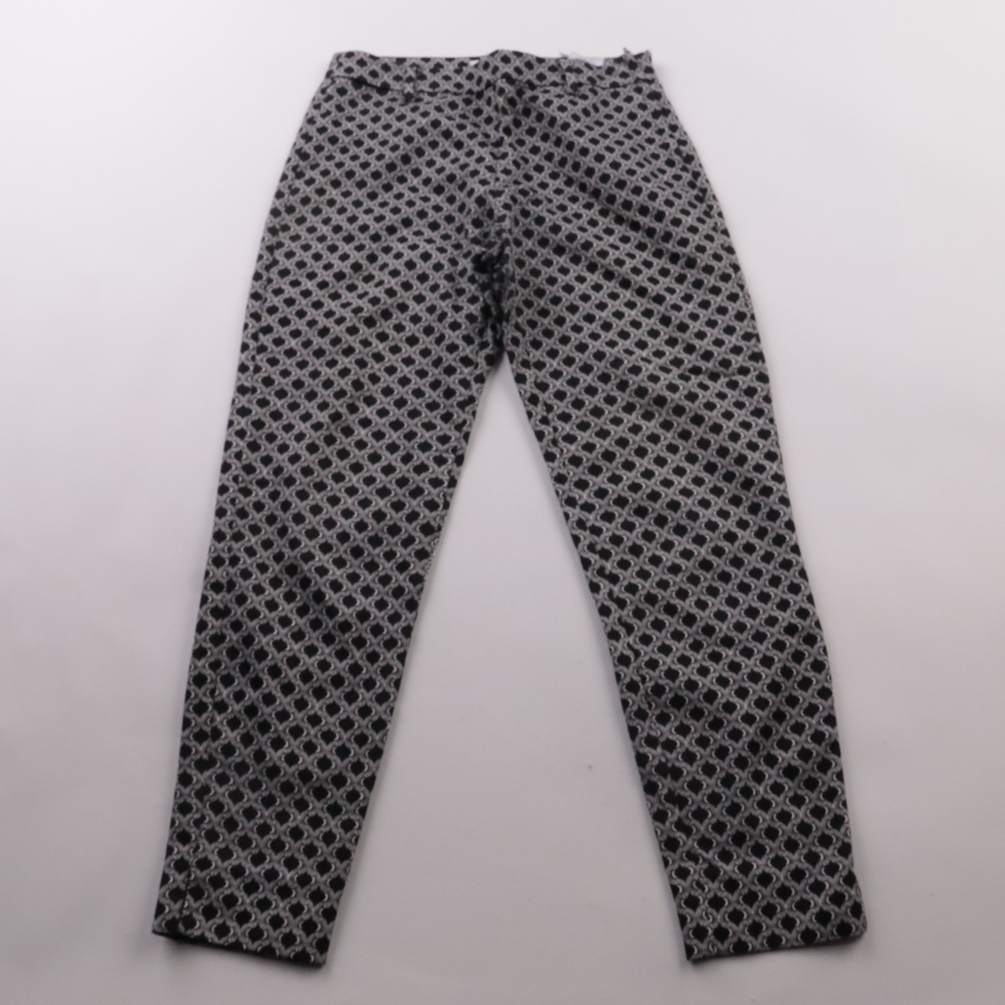 Женские брюки H&M прямого кроя с геометрическим черно-белым принтом. Подойдут для повседневных и офисных образов, легко сочетаются с однотонными топами и жакетами. Практичны в носке за счёт эластичности ткани и удобной посадки.