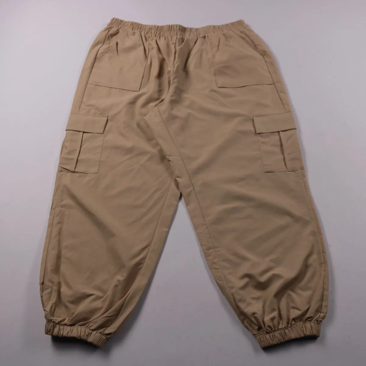 Женские брюки-карго Shein Curve бежевого цвета с эластичным поясом и манжетами по низу. Подойдут для повседневных образов и прогулок, когда нужны удобные карманы и свободная посадка. Лёгкий полиэстер быстро сохнет и не требует сложного ухода.