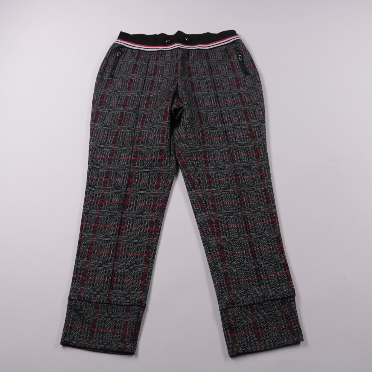 Женские брюки в серую клетку с бордовыми линиями и эластичным поясом на кулиске. Подойдут для повседневных и офисных образов в демисезон. Практичный плюс — ткань с эластаном, поэтому посадка комфортная и не сковывает движения.