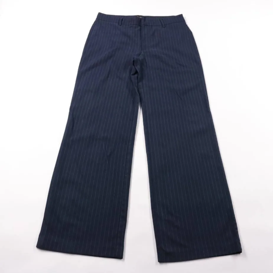 Брюки Pull&Bear тёмно-синего цвета в тонкую полоску, широкие по штанине (палаццо) и со шлёвками под ремень. Подойдут для офиса, учёбы и повседневных образов с рубашками и жакетами. Смесовая ткань с эластаном чуть тянется и удобна в носке.