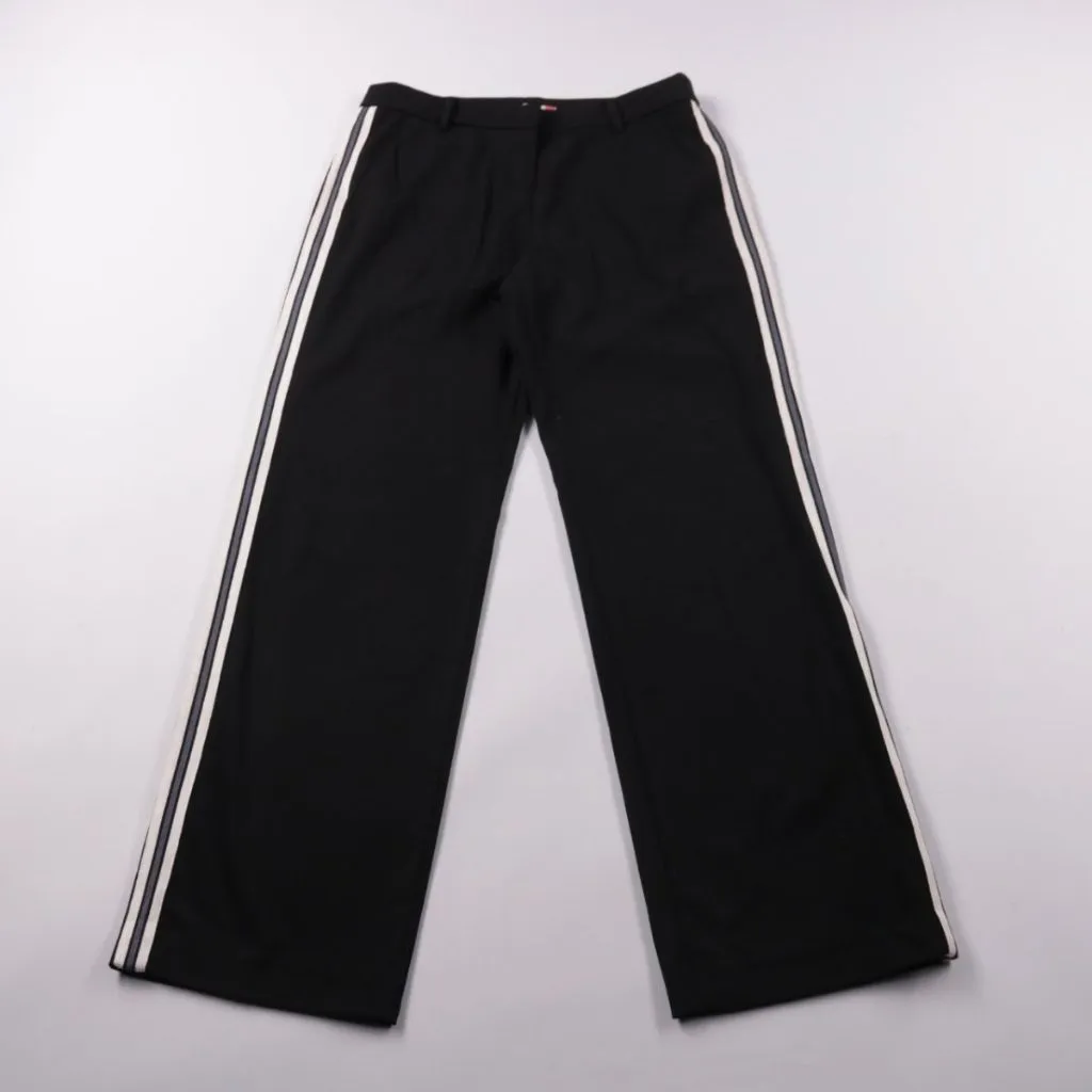 Женские брюки Esprit Recycled чёрного цвета с белыми лампасами по бокам. Широкий прямой крой подойдёт для повседневных образов и офиса в стиле smart casual. Ткань с добавлением эластана комфортно садится по фигуре и не сковывает движения.