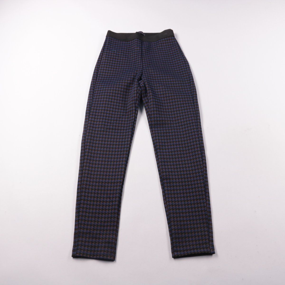 Женские зауженные брюки M&S с эластичным поясом и мелким узором «гусиная лапка» в сине-коричневых тонах. Подойдут для офиса и повседневных образов в прохладную погоду. Ткань с добавлением эластана немного тянется и комфортно садится по фигуре.