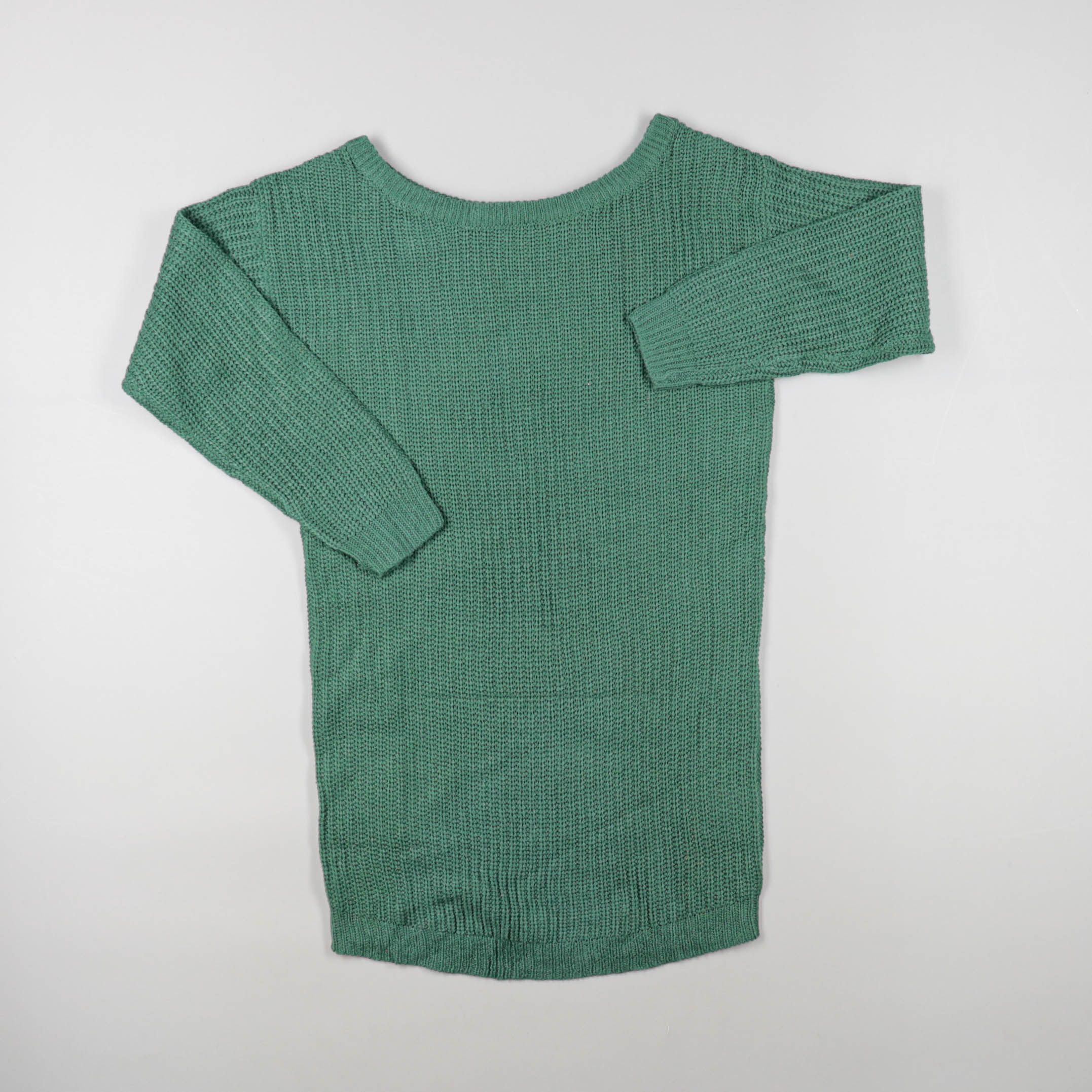 Вязаная кофта в зелёном цвете с фактурной резинкой и круглым вырезом. Подойдёт для повседневных образов в прохладную погоду, хорошо сочетается с джинсами и юбками. Практична за счёт плотной вязки и комфортных манжет на рукавах.