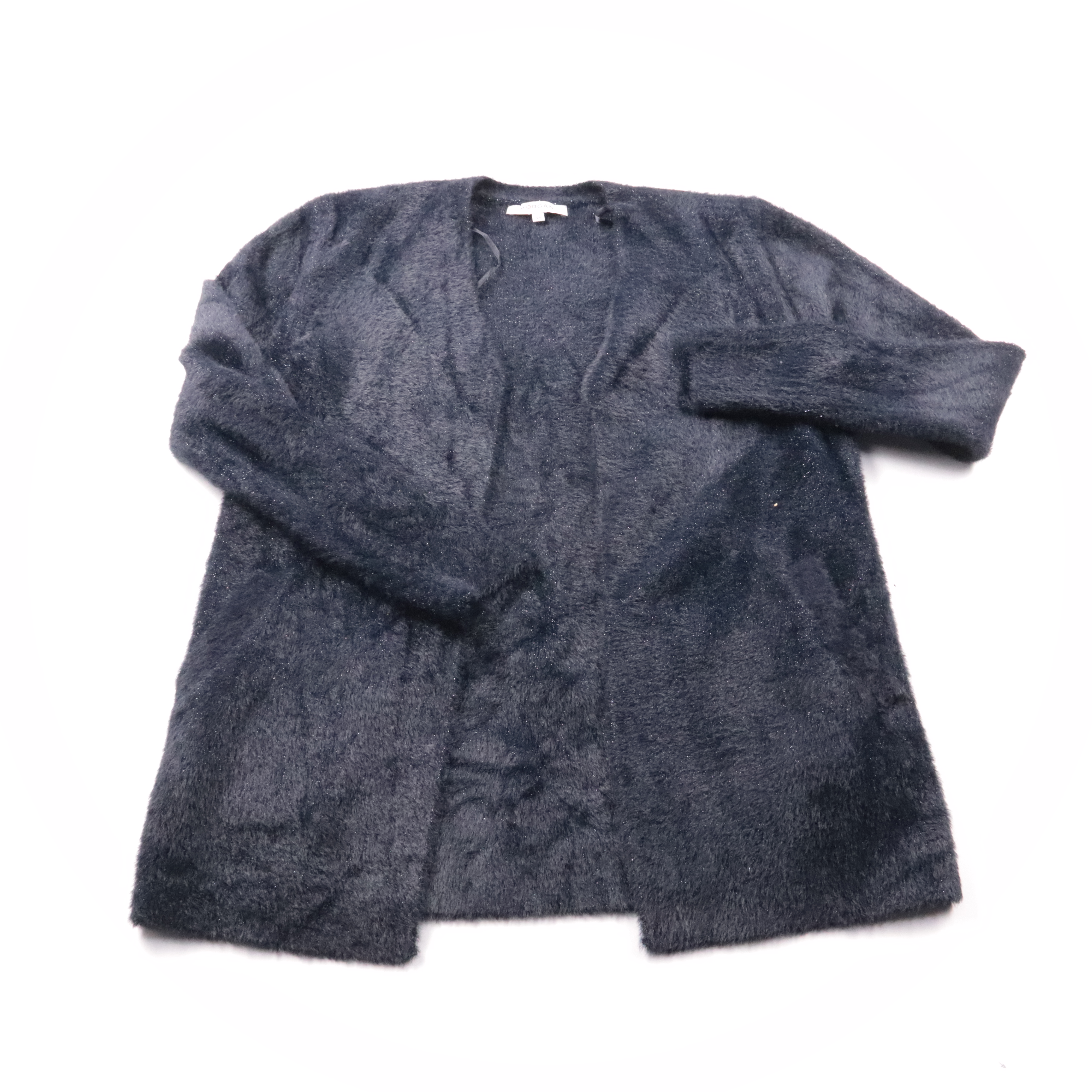 Кардиган Morgan из мягкого пушистого трикотажа тёмно-синего цвета с лёгким блеском люрекса и открытым передом. Подойдёт для прохладных дней и офисных образов, легко сочетается с джинсами и платьями. Практичный вариант: не мнётся и быстро добавляет тепл...