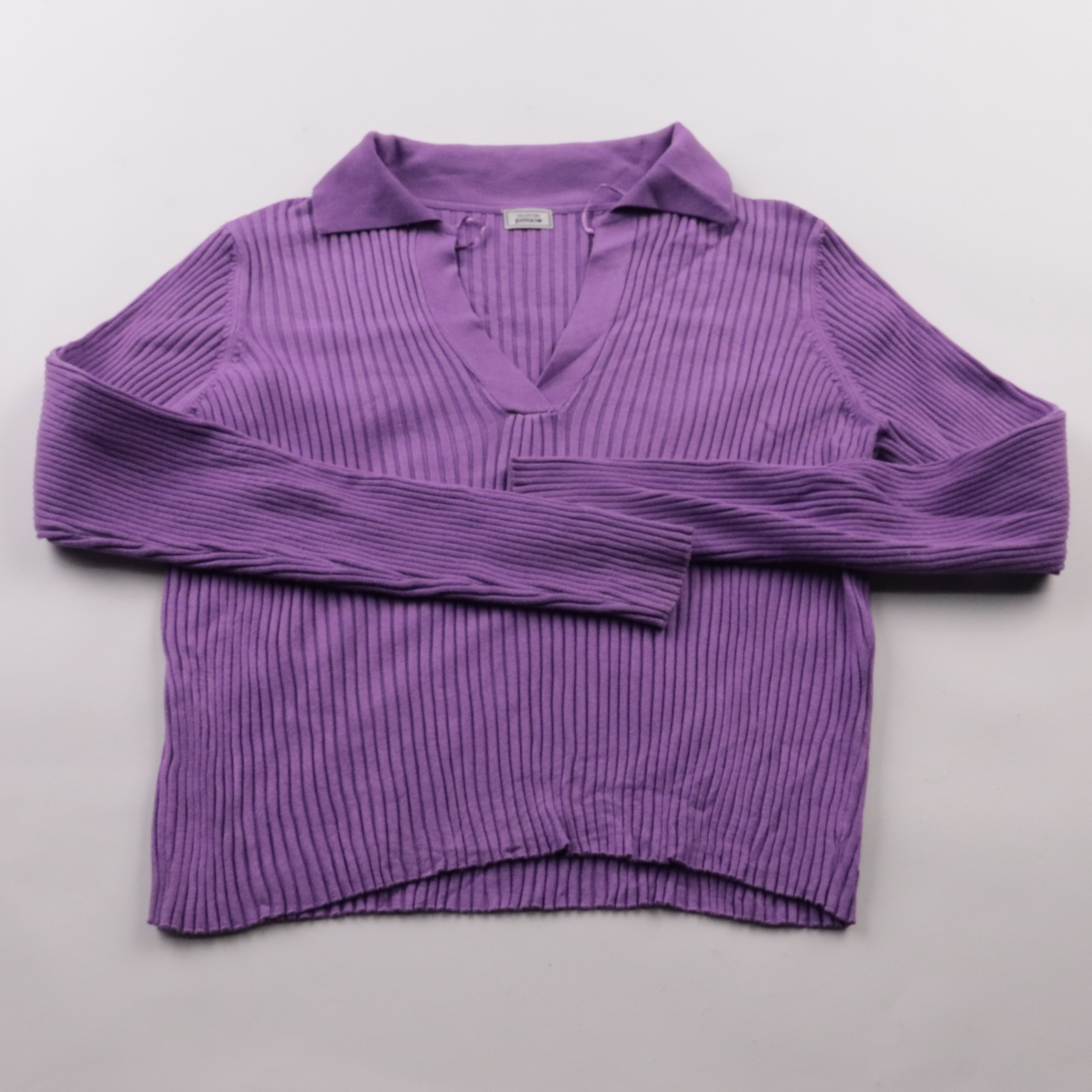 Рубчатый джемпер Pimkie фиолетового цвета с воротником-поло и V‑вырезом. Подойдёт для повседневных образов в прохладную погоду, хорошо смотрится с джинсами или юбкой. Трикотаж тянется и комфортно сидит по фигуре.