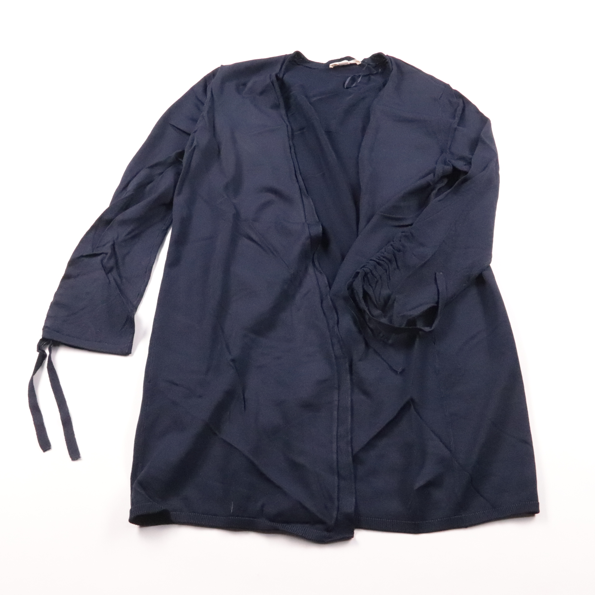 Темно-синий кардиган Esprit без застёжки, с длинными рукавами и завязками. Подойдёт для офиса и повседневных образов в прохладную погоду, легко сочетается с платьями и брюками. Мягкий материал приятен к телу и удобно носится слоями.