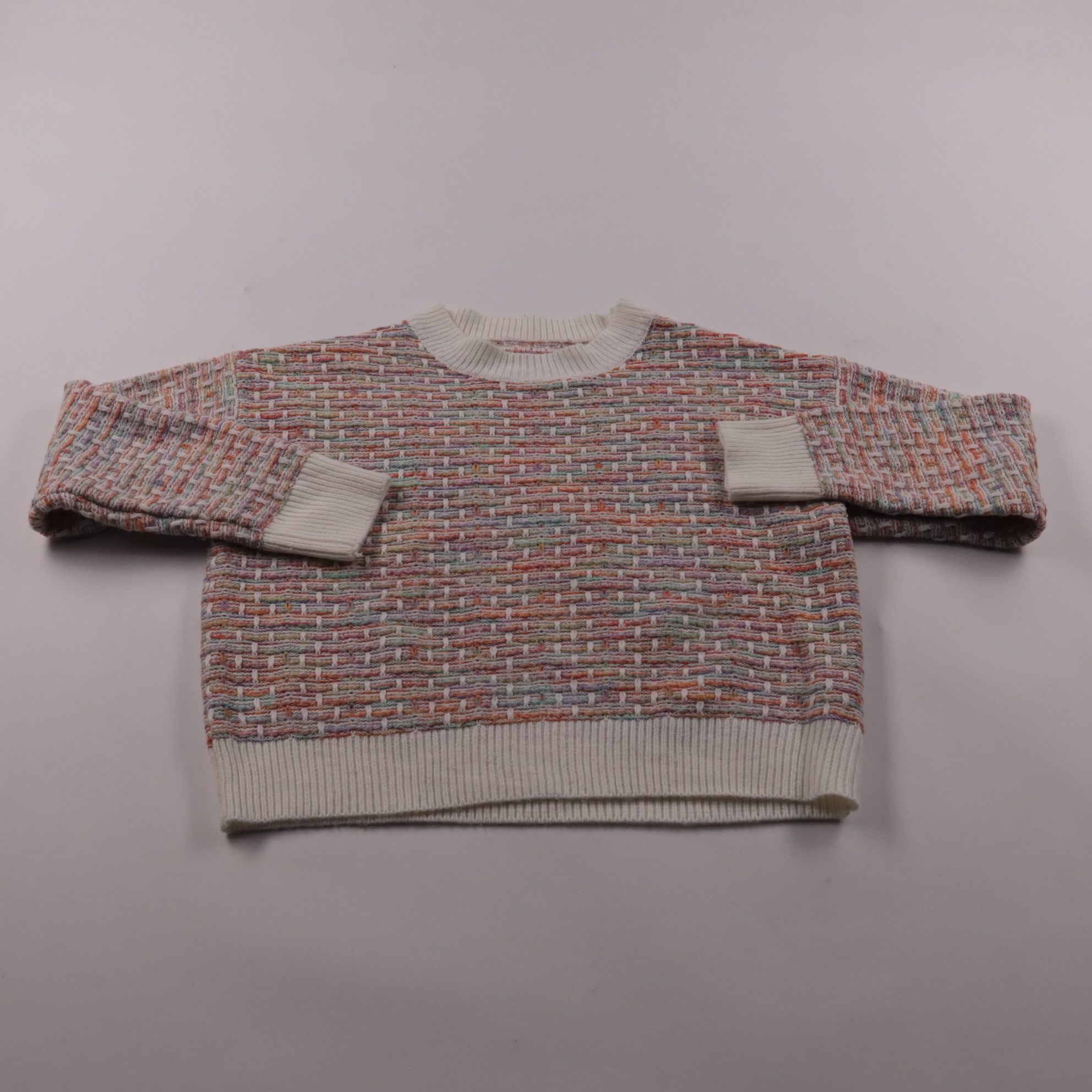 Вязаный джемпер Shein с круглым вырезом и фактурным узором в разноцветной пряже. Подойдёт для повседневных образов в прохладную погоду, легко сочетается с джинсами и юбками. Практичный плюс — мягкий акрил хорошо держит форму и неприхотлив в уходе.