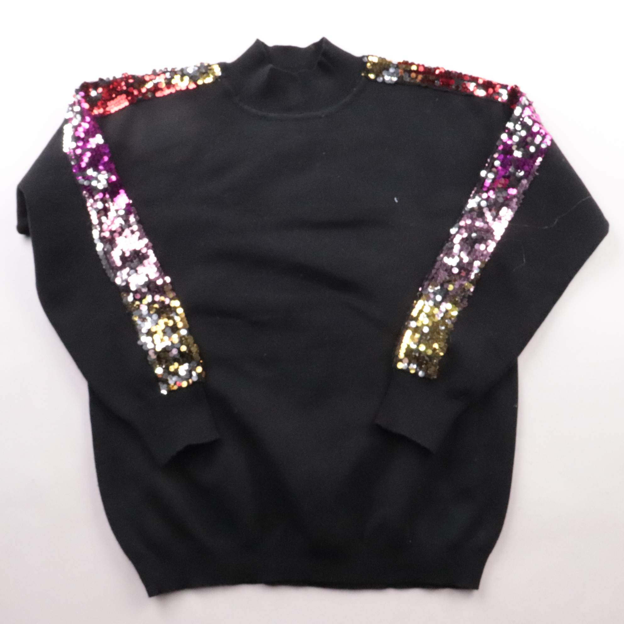 Чёрный свитер QED London с высоким воротом и яркими вставками из пайеток на рукавах. Подойдёт для вечерних выходов и акцента в повседневных образах с джинсами или юбкой. Плотный трикотаж держит форму и комфортно сидит.