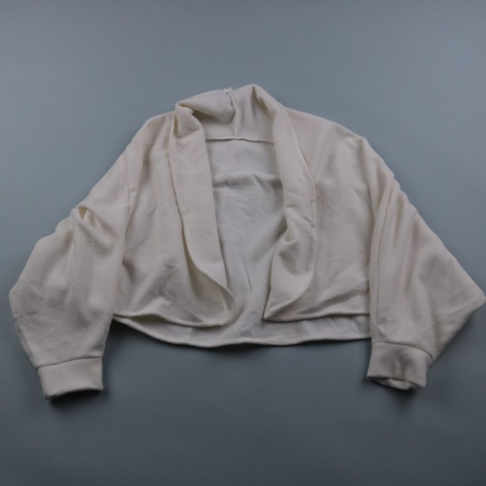 Короткое болеро Takko молочного цвета из мягкого полиэстера, с драпированными полочками и манжетами на рукавах. Подойдёт как лёгкий верхний слой к платью или топу в прохладный вечер. Практично тем, что почти не мнётся и быстро сохнет после стирки.