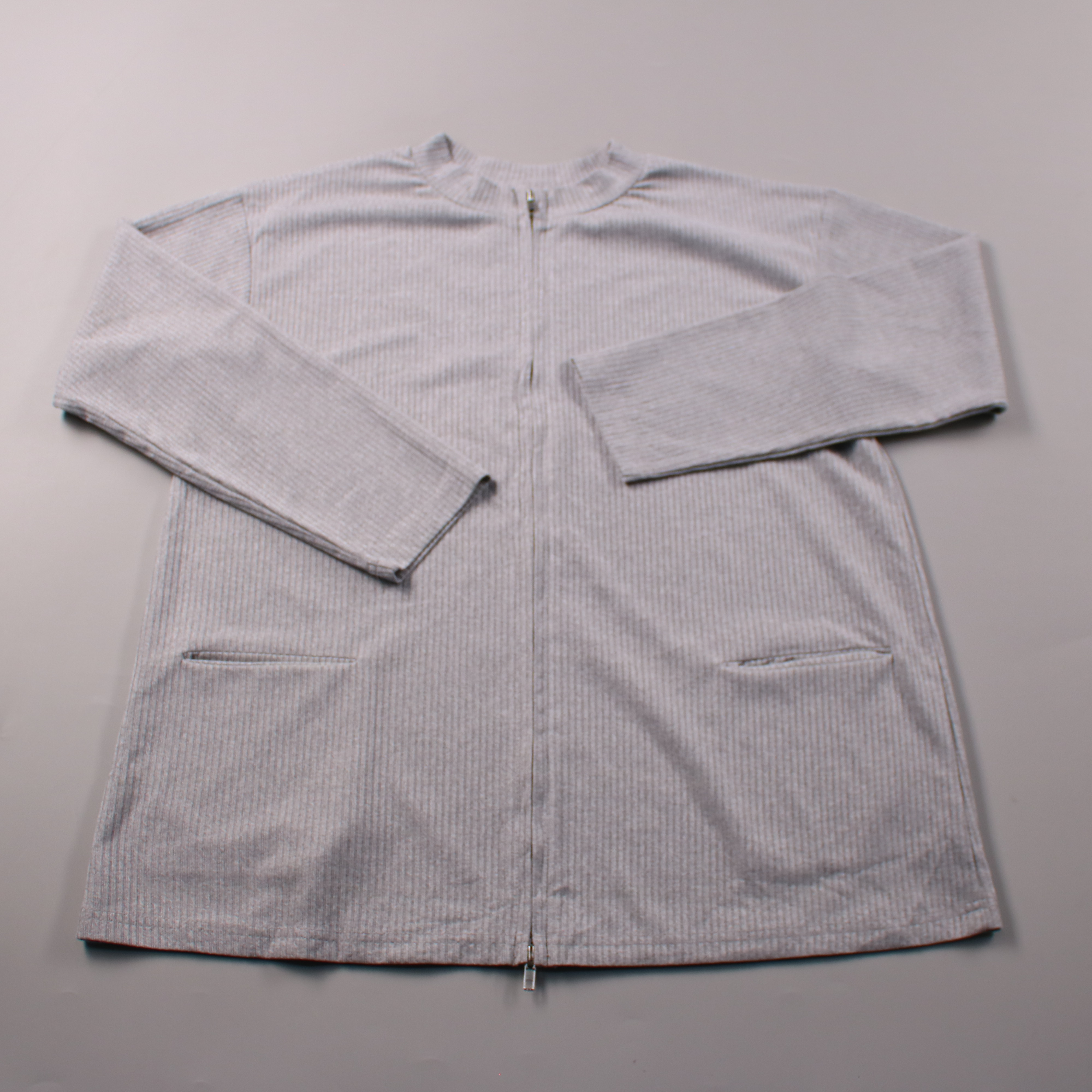 Женский серый кардиган в рубчик на молнии, размер M, из эластичного трикотажа. Подойдёт для повседневных образов и как второй слой в офис или на прогулку. Практичен тем, что быстро надевается и регулируется по посадке молнией.