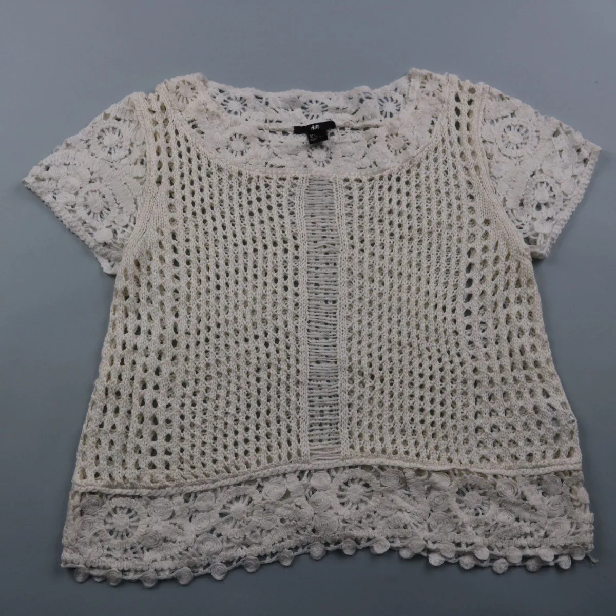 Ажурный кардиган H&M молочного оттенка с коротким рукавом и открытым передом. Подойдёт для летних образов поверх топа или платья, когда нужен лёгкий слой. За счёт сетчатой вязки хорошо проветривается и не утяжеляет образ.