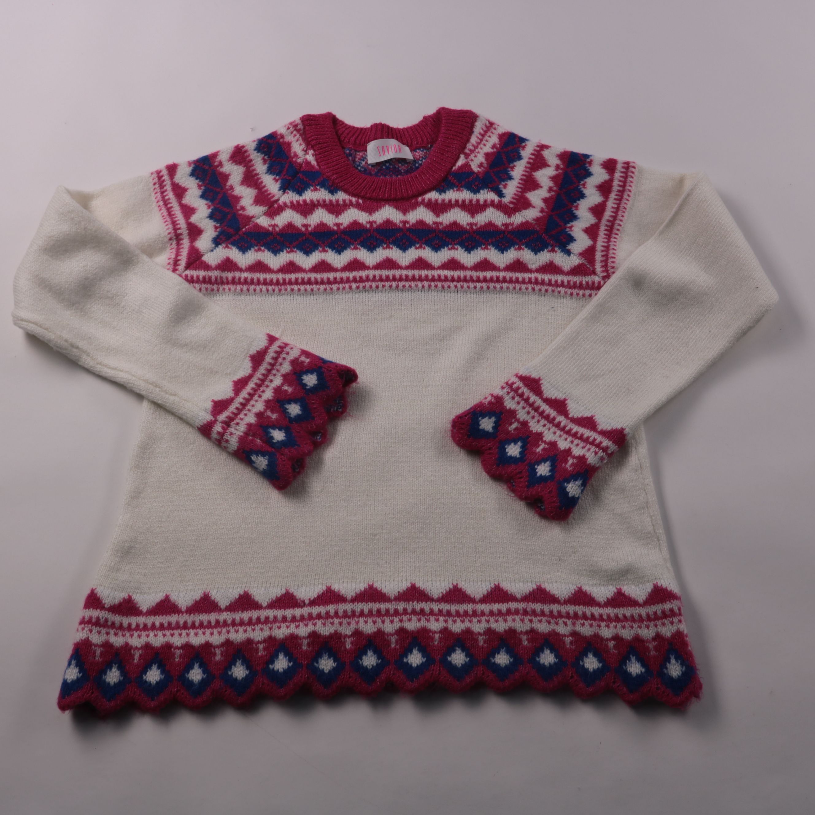 Вязаный свитер Savida молочного цвета с жаккардовым орнаментом в розово-бордовых и синих тонах. Подойдёт для повседневных зимних образов и прогулок в холодную погоду. Практичный плюс — мягкий трикотаж и удобная посадка, хорошо смотрится как с джинсами,...