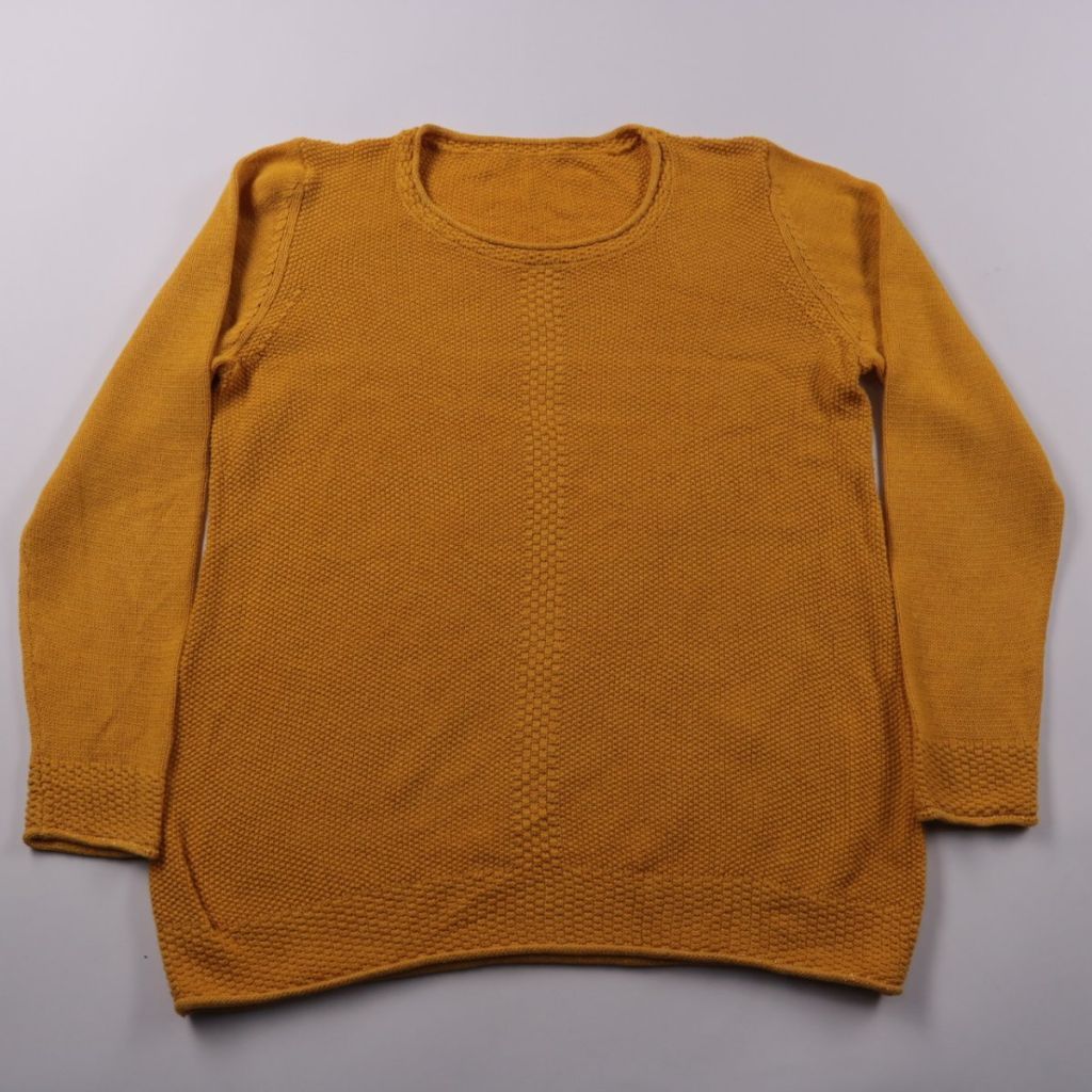 Вязаный джемпер Adler горчичного цвета с круглым вырезом и длинным рукавом. Подойдёт для повседневных образов в прохладную погоду, можно носить с джинсами или юбкой. Смесь хлопка и акрила практична в уходе и комфортна в носке.