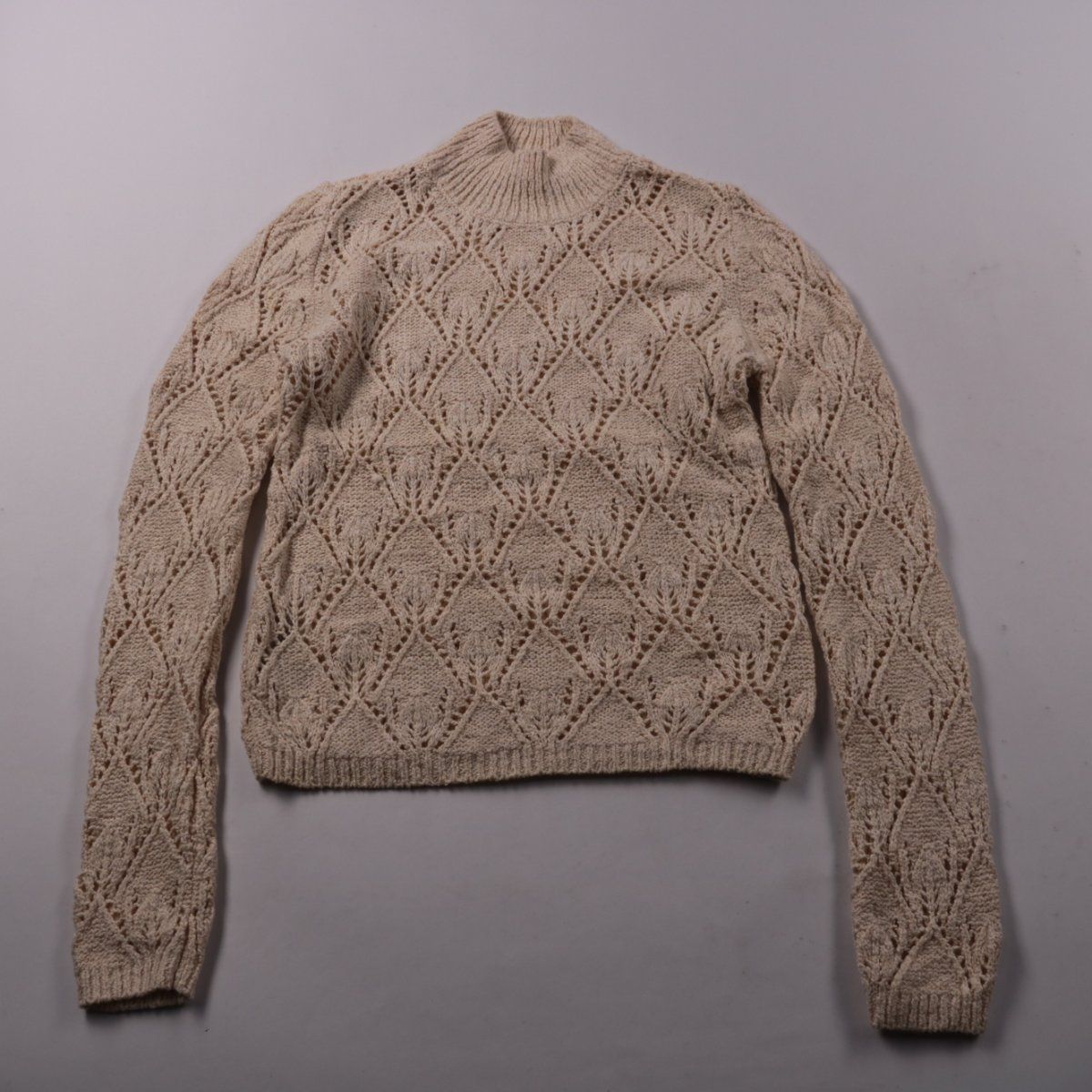 Женский свитер MNG бежевого цвета с ажурной вязкой в ромбы и высоким воротником-стойкой. Подойдёт для прохладной погоды и многослойных образов с джинсами или юбкой. Практичный плюс — мягкий трикотаж и фактурный узор, который делает вещь заметной без сложного декора.