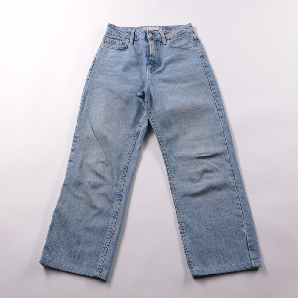 Женские джинсы Zara из плотного голубого денима, прямой посадки и с высокой талией. Подойдут для повседневных образов с кедами, ботинками или каблуками. Натуральный хлопок хорошо держит форму и комфортен в носке.