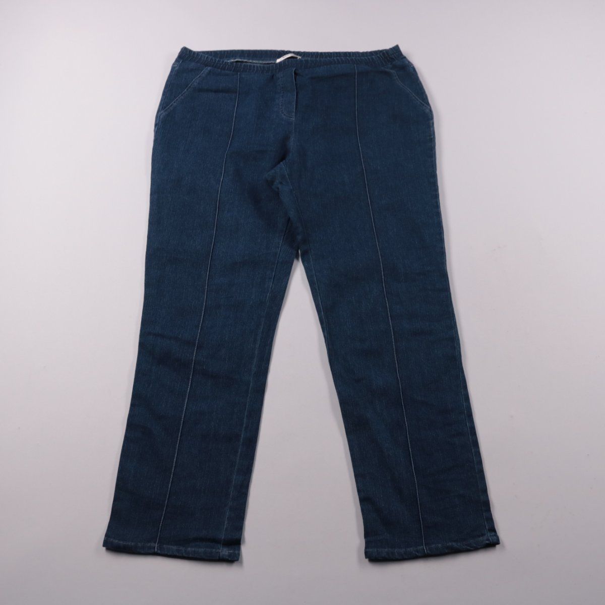 Джинсы Afibel тёмно-синего цвета с эластичным поясом без застёжки и декоративными швами спереди. Подойдут для повседневной носки и в офис в сочетании с блузками и свитерами. Удобно сидят на талии и быстро надеваются благодаря резинке.