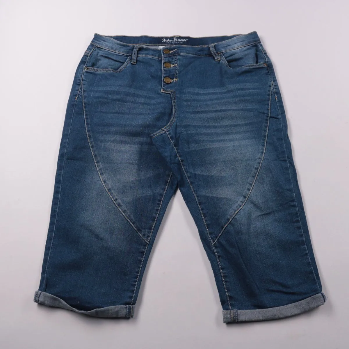 Женские джинсы John Baner из денима с лёгкой посадкой и эластичной добавкой, укороченные с подворотами. Подойдут для повседневных образов в тёплый сезон и для дома/отдыха. Практичны за счёт удобной застёжки на пуговицах и мягкой ткани, которая не сковывает движения.