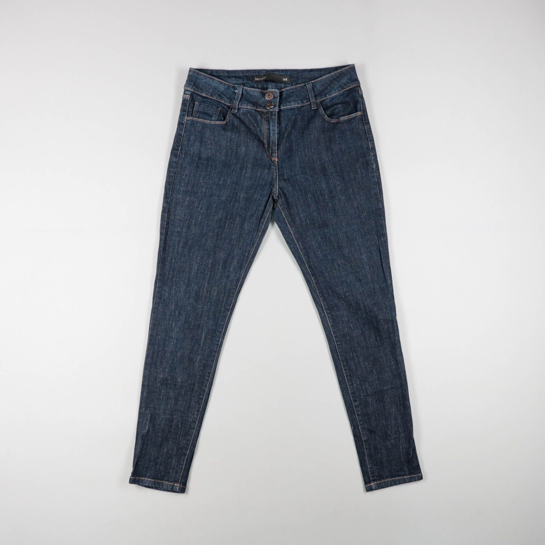 Женские джинсы-скинни, бренд не указан. Тёмно-синий деним, застёжка на пуговицах, классические карманы. Подойдут для повседневных образов и удобно садятся по фигуре за счёт узкого кроя.