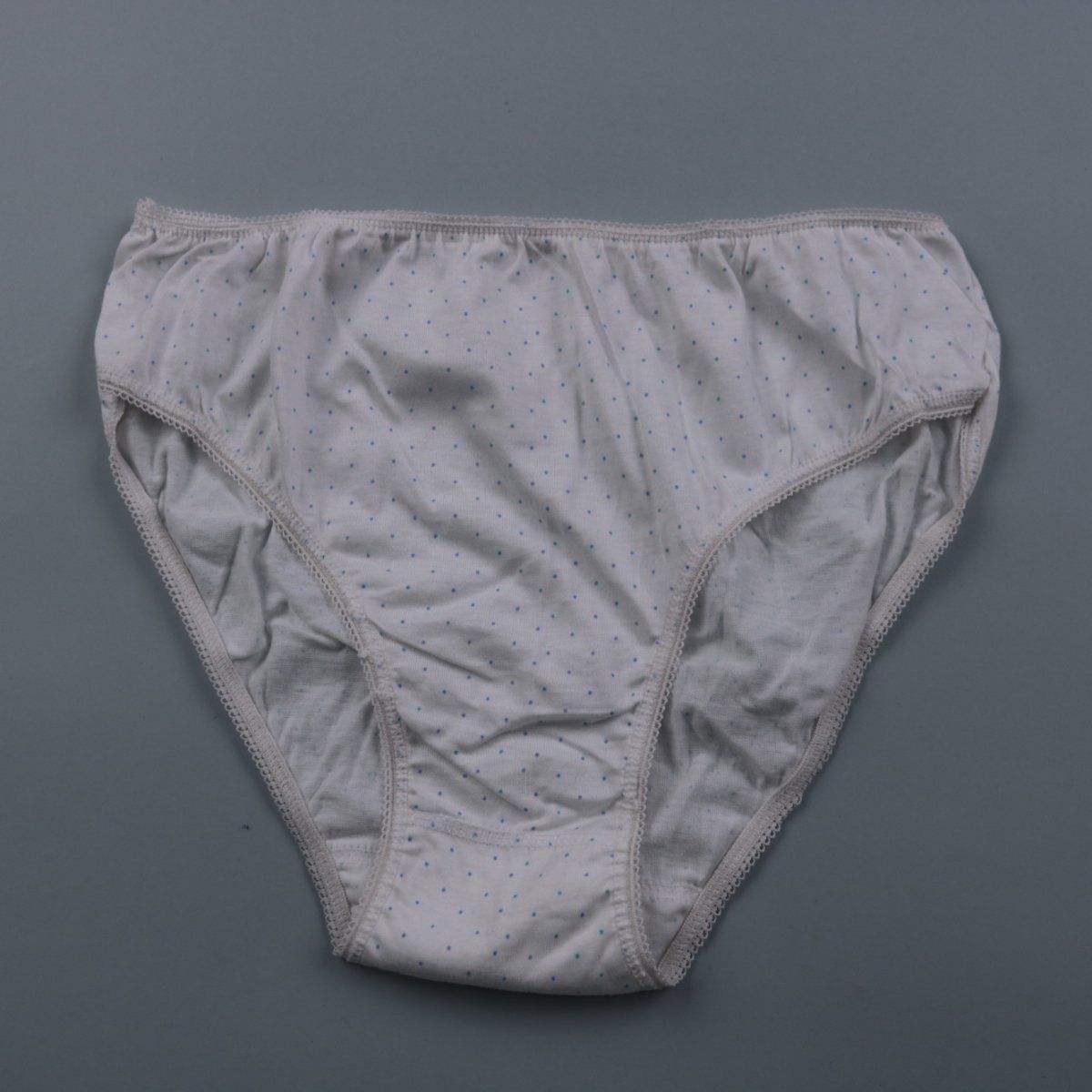 Женские трусы-слипы из 100% хлопка, белые в мелкий голубой горошек, с мягкой кружевной окантовкой. Подойдут для повседневной носки благодаря классической посадке. Хлопок хорошо дышит и комфортен к телу.