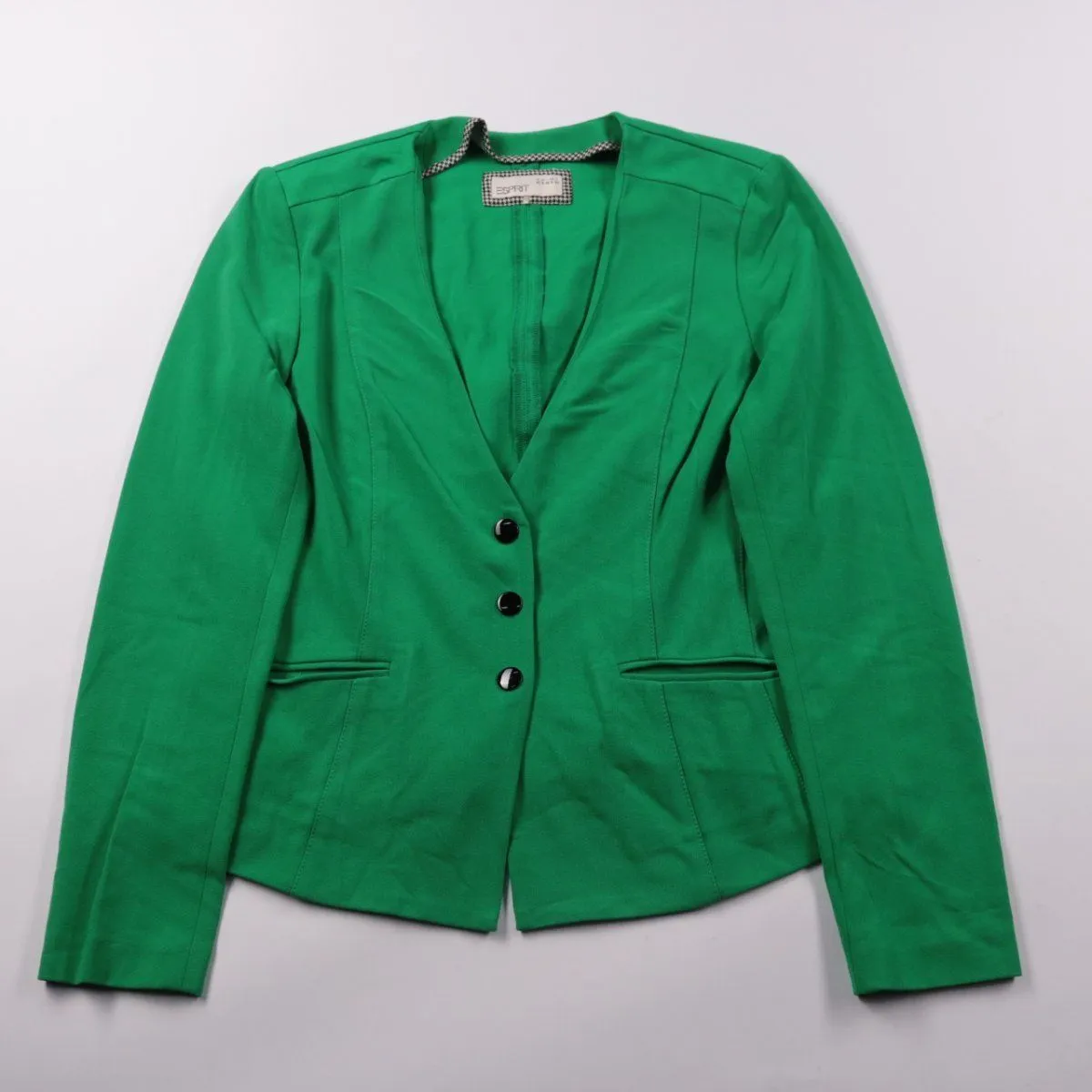 Женский приталенный пиджак Esprit ярко-зелёного цвета на трёх пуговицах, с аккуратными карманами-«листочками». Подойдёт для офиса, встреч и нарядных повседневных образов с брюками, юбкой или джинсами. Лёгкий материал и чёткий крой хорошо держат форму и удобно садятся по фигуре.