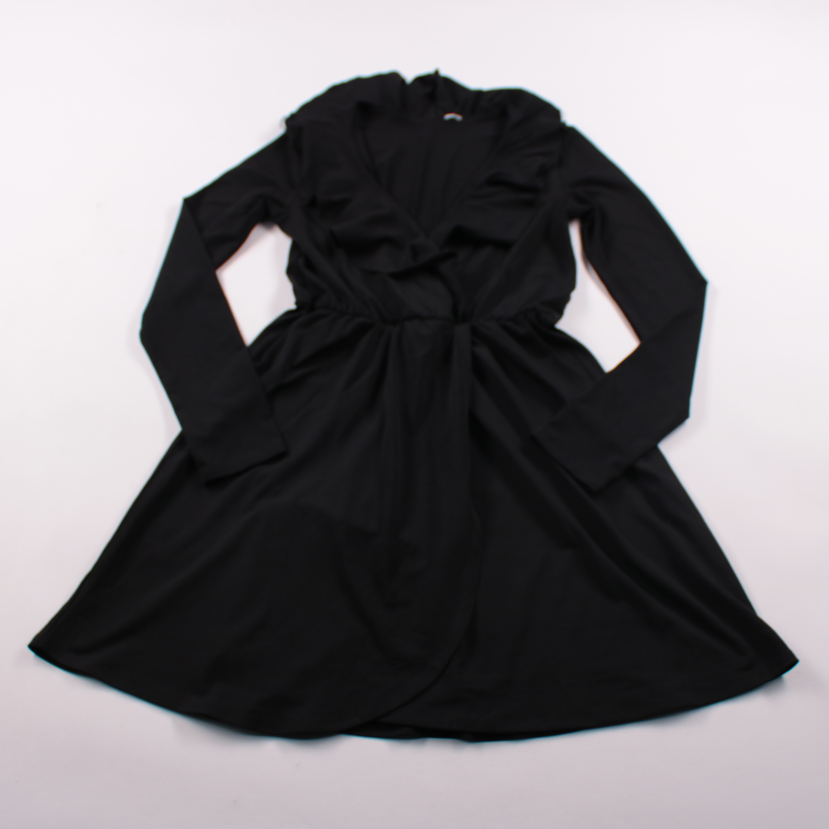 Женское чёрное повседневное платье с длинным рукавом и подчёркнутой талией. Подойдёт для офиса и на каждый день, легко сочетается с ботинками или туфлями. Практичный плюс — ткань почти не мнётся и быстро сохнет.